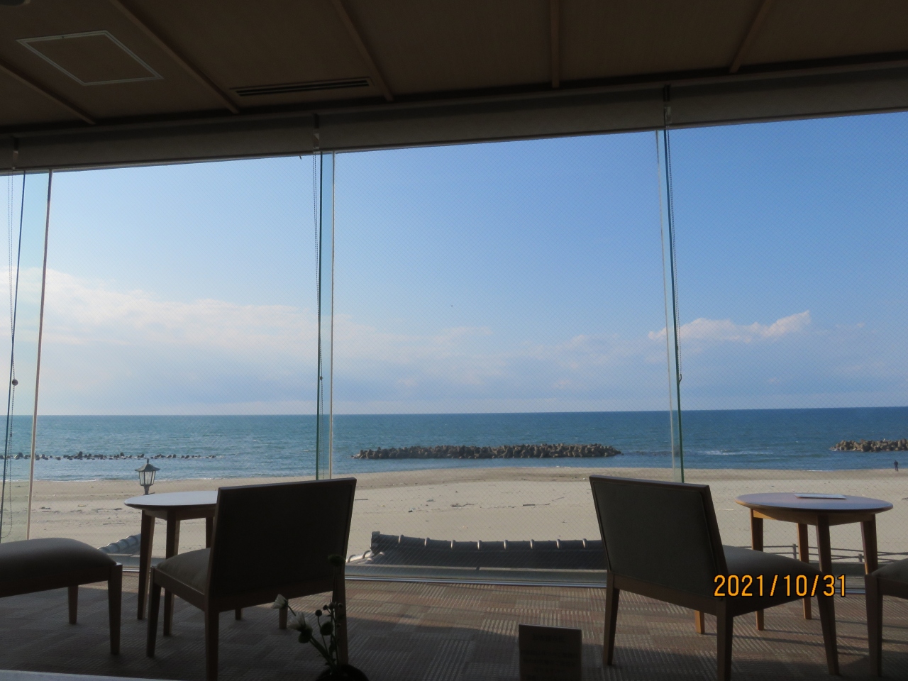 日本海側に面した1Fロビーは全面ガラス張りで、目の前に砂浜を介して日本海を眺めることができます。タクシー運転手さんの話では、改築直後は子連れ客は受けない大人専用の宿だったようですが、現在はその制限はありません。 なので、宿の作り自体は落ち着いた感じで寛げました。 宿の方も気さくで、気の利いた対応でした。