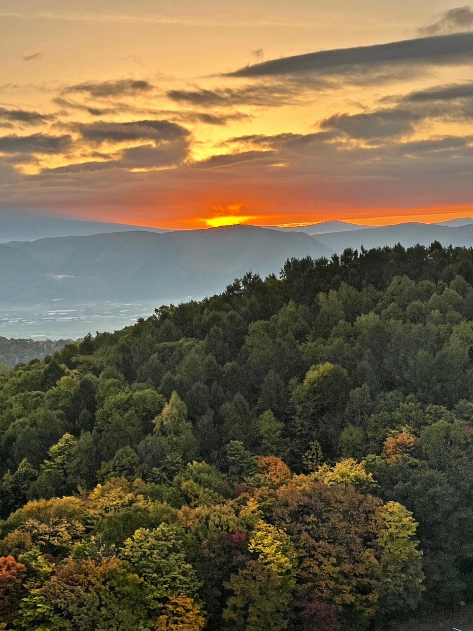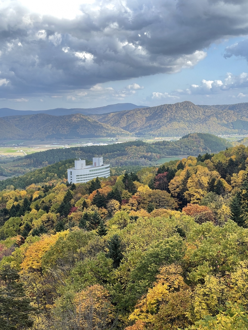 小高い丘に建つホテルは、部屋からの眺めが素晴らしいです。正面に十勝岳、それに連なる山々の夕焼けや朝焼け、時には雲海。直ぐ下には「ニングルテラス」の紅葉した樹々。