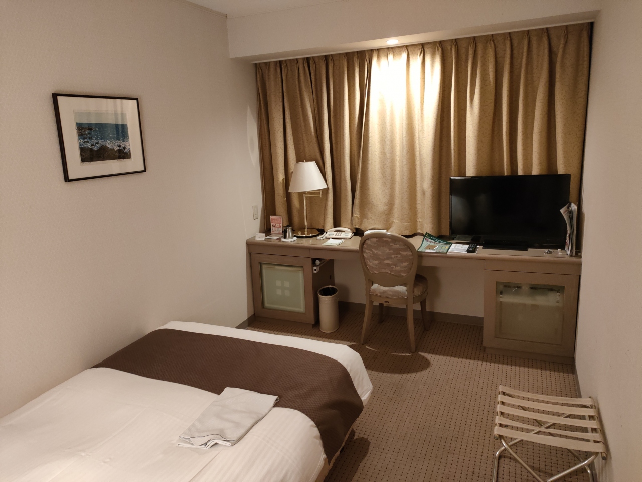 部屋は広めでスーツケースを広げても余裕がありました。10月初旬で寒くない時期だからでしょうか、室温が高めで冷房を使いたかったが空調は集中式で冷房・暖房が選べず使えなかった。体感温度は個人差があるので、季節が微妙な時期は集中式は困ります。