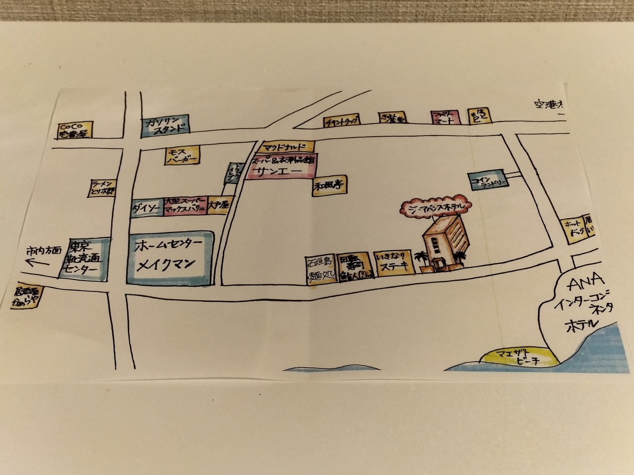 港や石垣の繁華街からは少し離れていますが、スーパーはマックスバリューとサンエーが近くにあります。飲食店も回転寿司屋、いきなりステーキ、麺処がホテルの並びにあります。バス停も近いです。