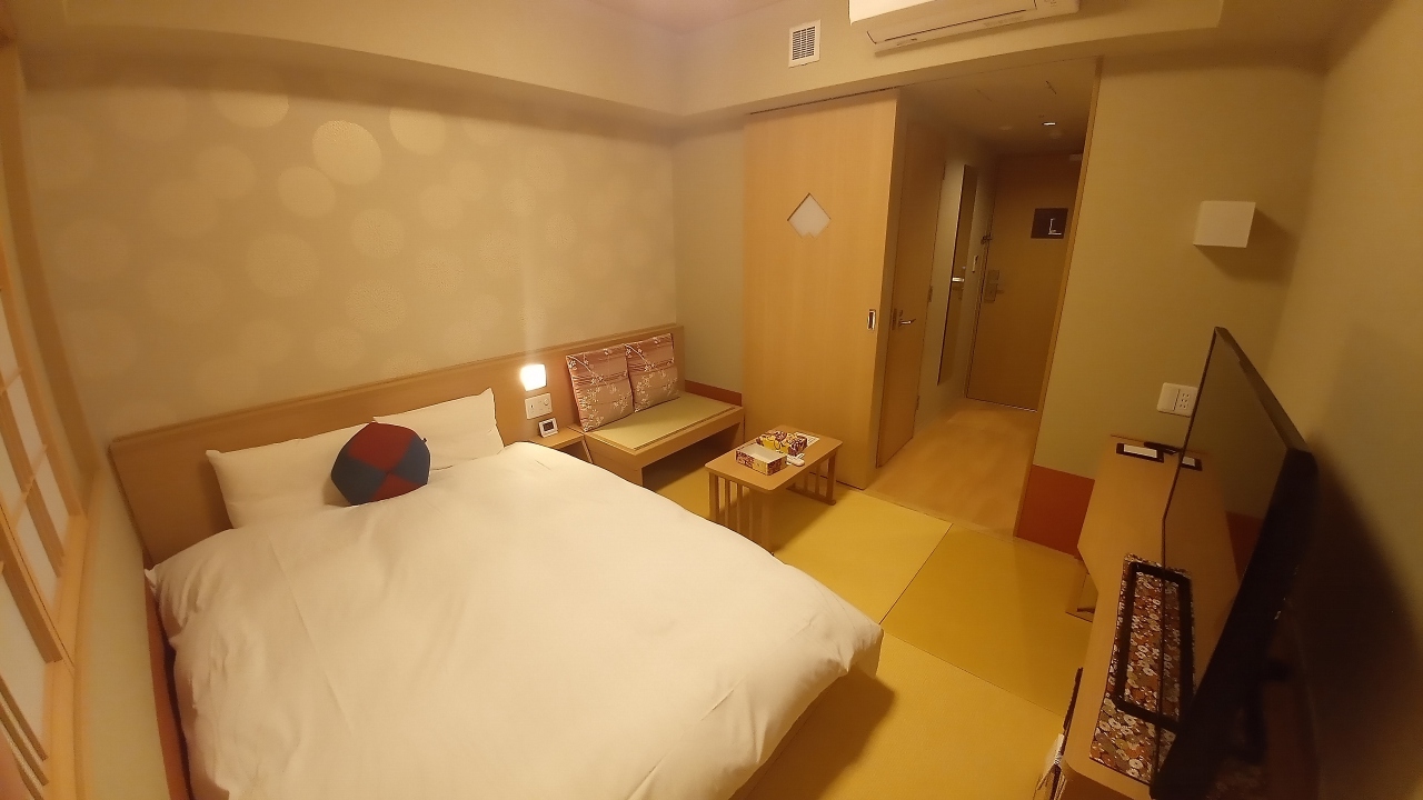 全館畳敷き。玄関を入るとすぐ靴を脱いでフロントに向かう形態はまるでスーパー銭湯のようですが、入ってしまえば気持ちよく過ごせます。大浴場を備えているため、このタイプの客室はバスタブが無く狭いシャワーブースだけですが、そこは割り切りということでしょう。ドーミーインチェーン共通のサービス(夜鳴きそば等)もあり、全体的なコスパは高いと感じます。
