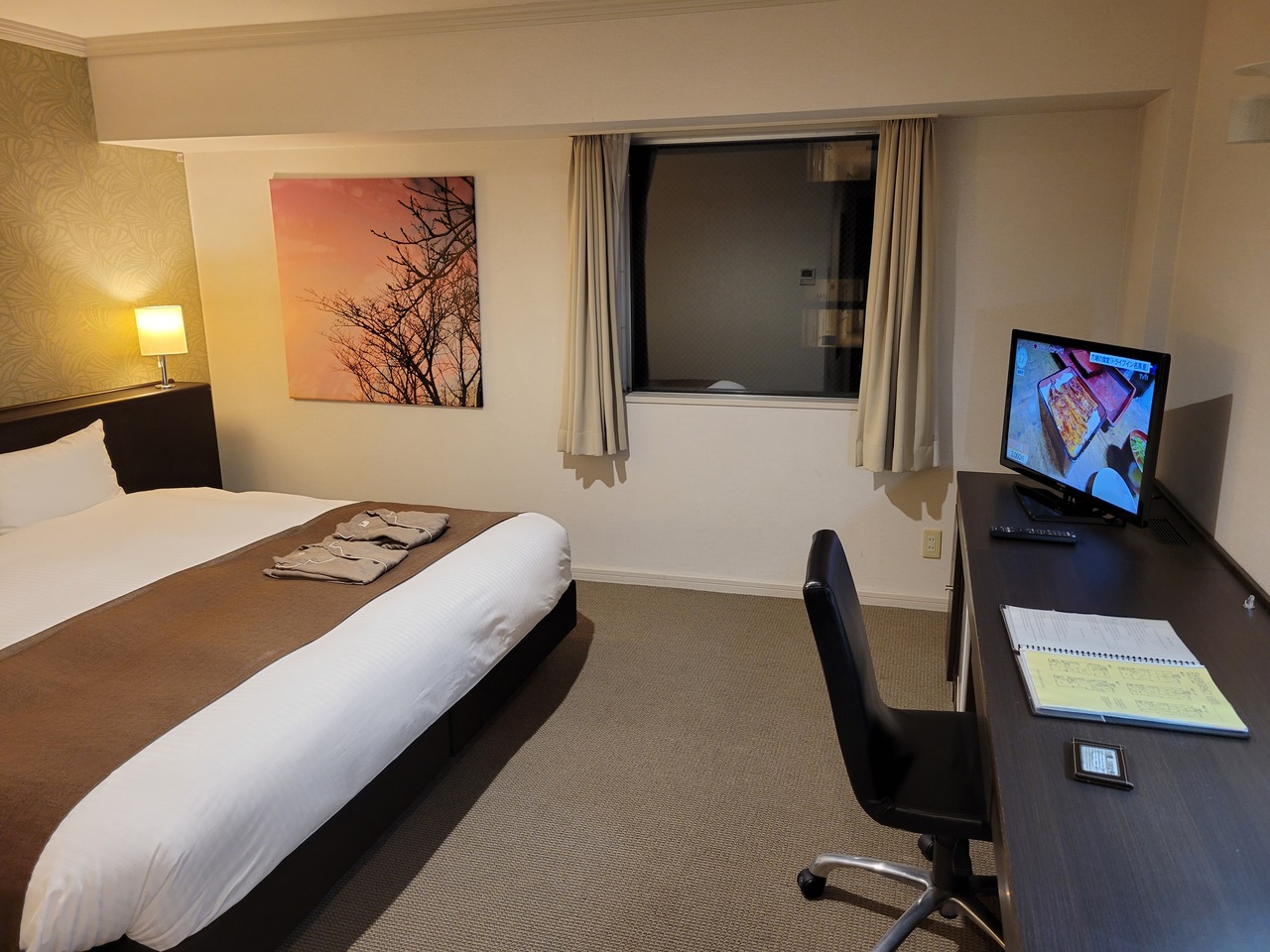 部屋は一人だと贅沢なくらい広々したダブルルームで快適に過ごせました。デスクも広めで使い勝手がよかったです。朝食バイキングは朝から北海道らしいものがいただけて満足しました。いくらやエビフライ、魚介のアクアパッツァがおいしかったです。