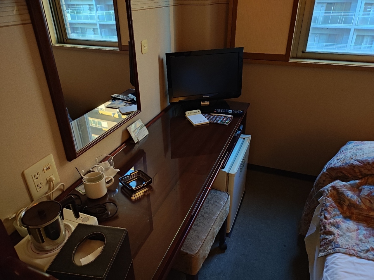 浜松の繁華街は、線路の北側の、駅前通りから西側に広がり、当該ホテルのある東側は、浜松駅まで地下道でつながっている立地のわりにもっぱら静かな住宅地となっている。なので、ちょっと食事しに外に出るとかすると結構歩かされ、駅からも、タクシー乗るほど遠くはないけど、荷物持って歩くには近くもないといった微妙な距離感である。館名の「アクト」は、三大都市圏以外では唯一、200m以上の高さがある超高層ビルであるアクトシティに近いことに由来すると思われ、アクトシティの中にある施設というわけではない。ホテルの建物自体に新しさ感はなく、居室やバス・トイレも狭めである。