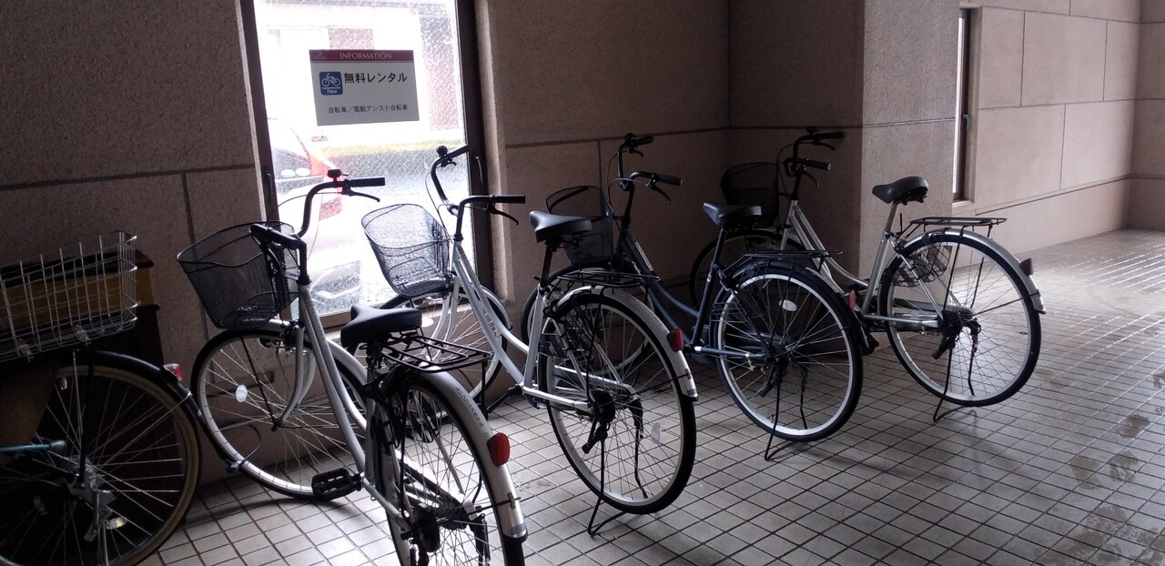 裏口からが便利です。無料貸出自転車を利用しました。