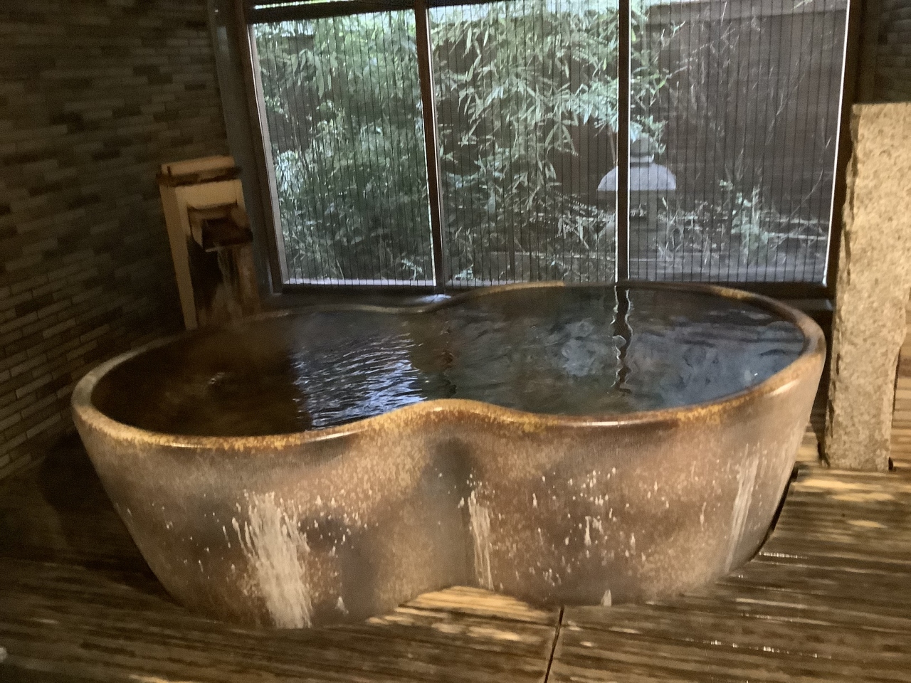 - 参道に面したお宿なので露天風呂といっても開放感に限界がある。代わりに四つある貸切風呂は自由に使用できるが時間帯によっては激込み。
