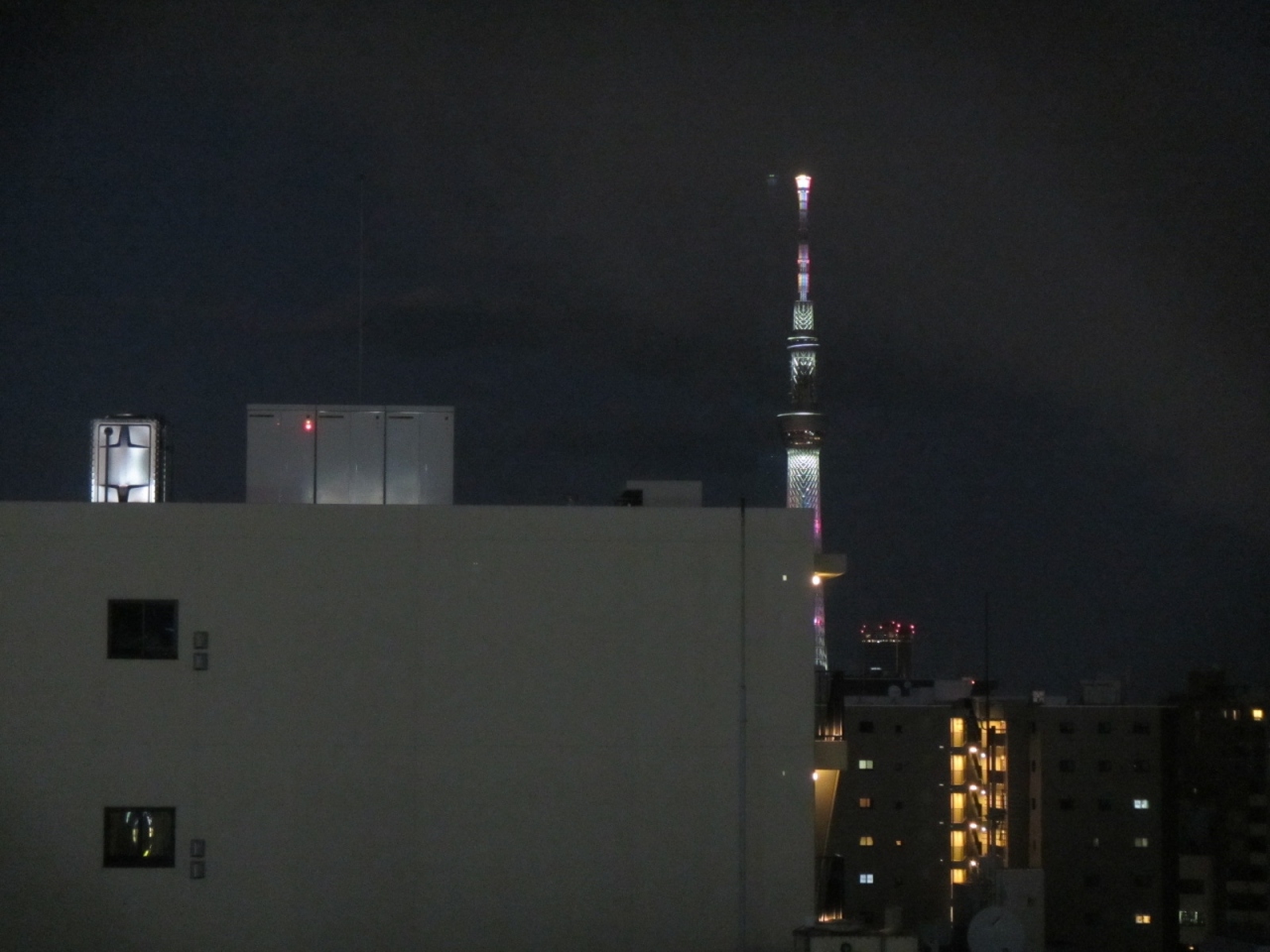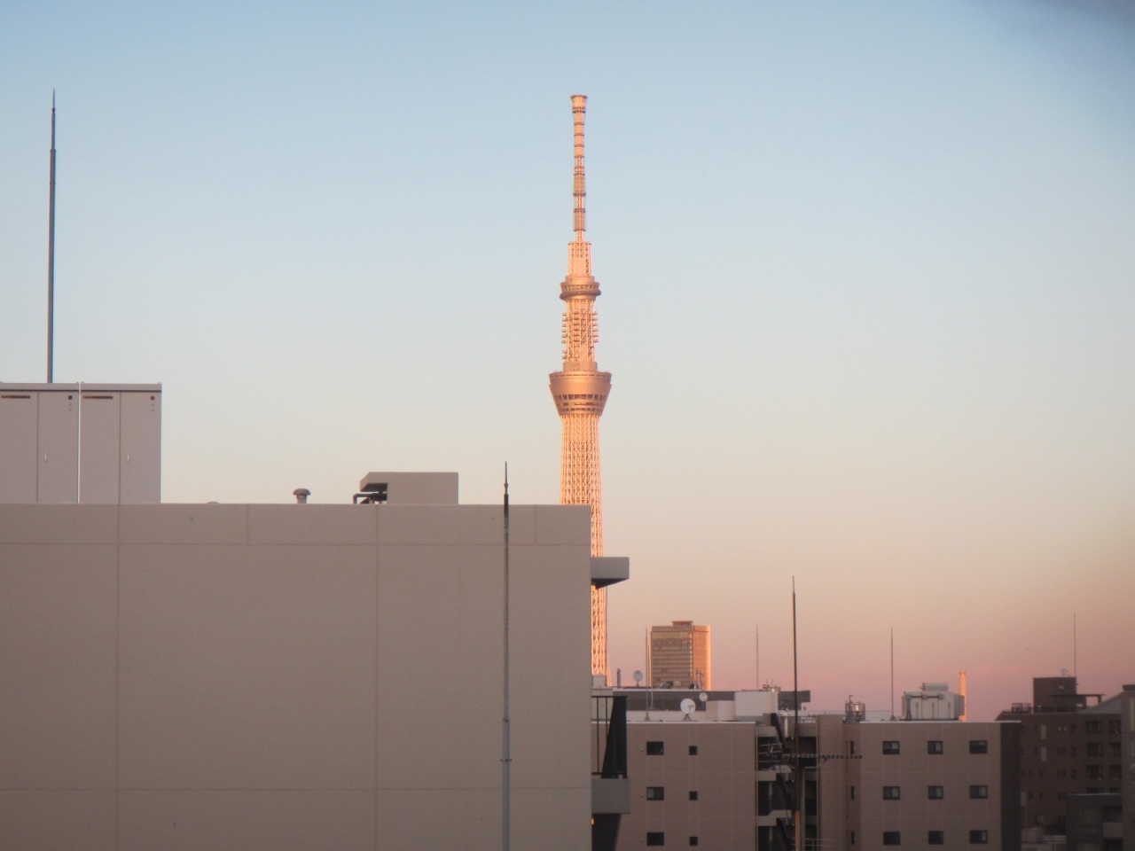 馬喰町駅前のホテルでは、上階の部屋になると、部屋の方向にもよりますが、東京スカイツリーが見えます。朝の清々しいタワーや夕日に染まる様子、夜のライトアップなど、窓からちょこっとですが景色を楽しむことができました。