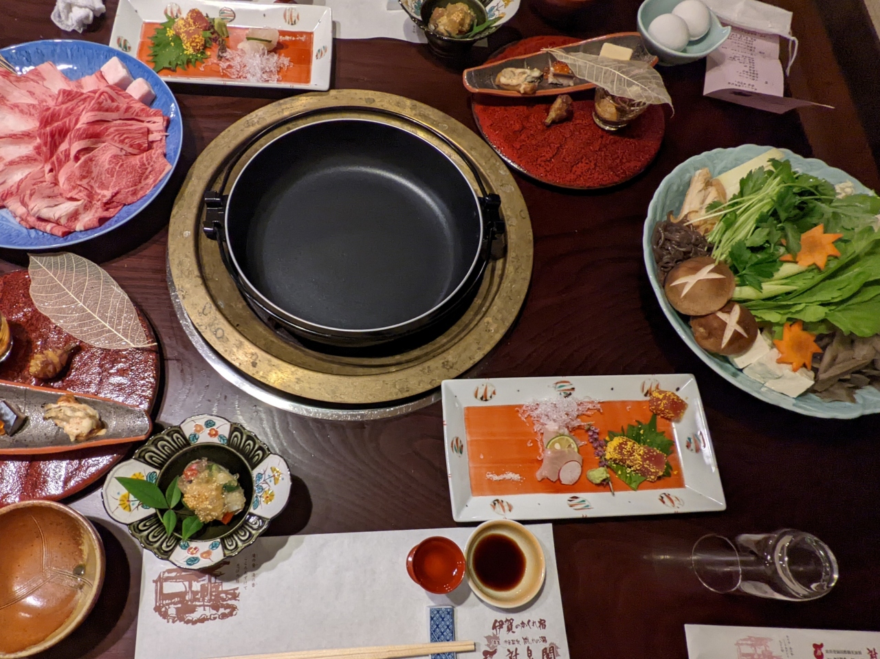 赤目四十八滝の入り口に一番近い宿。丁寧なお迎えを受けます。館内はやや複雑な造りで、一瞬迷いそうになりました。お部屋は広く、窓の外には、紅葉の時期だったらさぞよかったのだろう、と思われる山がありました。お風呂は内風呂と露天が離れているため、いったん着替えなくてはならないのが面倒。女性露天は全方向オープンエアではなかったので少しがっかりしました。もう少し湯温を上げてほしいです。さて肝心の夕食には伊賀牛のすき焼きをお願いしました。おかずは他にもいくつかありましたが、メインはすき焼き。久しぶりに美味しいすき焼きをたっぷりいただきました。追加注文したとろ寿しもとろけるようなおいしさです。お正月に宿泊したので、朝食にはお雑煮と、おせち料理が出てきて、特別な朝を迎えることができました。館内のショーケースには、忍者の装束や小道具が展示されており、伊賀の歴史が感じられます。