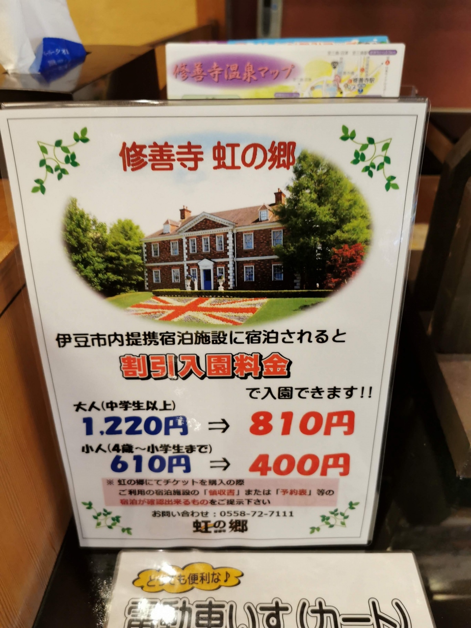 無料貸出の電動自転車で虹の郷まで行くのがオススメ。自転車もPanasonic製で新しく、坂道でもパワフルだった。20分ぐらいで到着できる。虹の郷ではSLや富士山の景色などが楽しめる。また、修善寺温泉に宿泊の領収書があると、虹の郷は3割引に窓口でなる。