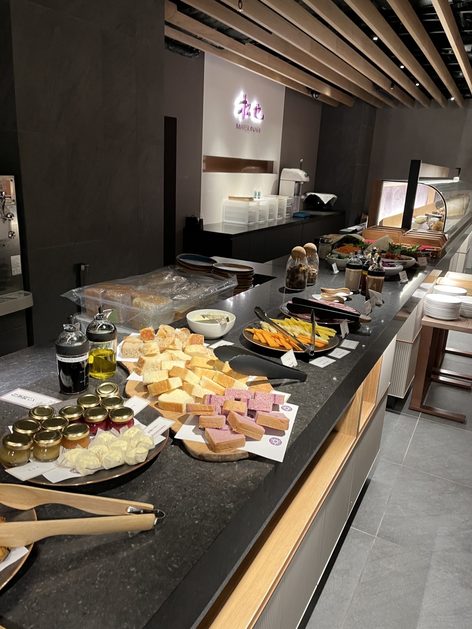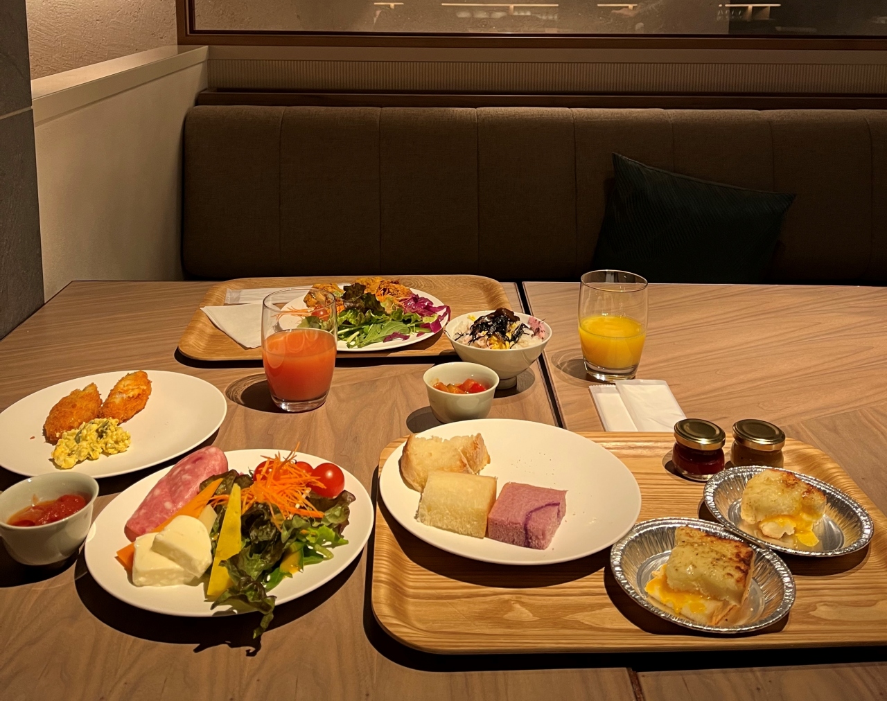 マリオットプラチナ特典で、朝食が無料で食べられるほか、イブニングカクテルのサービスがあり、おばんざいやアルコールがいただけました。朝食はビュッフェ形式で、自家製のパンなどがいただけて良かったです。