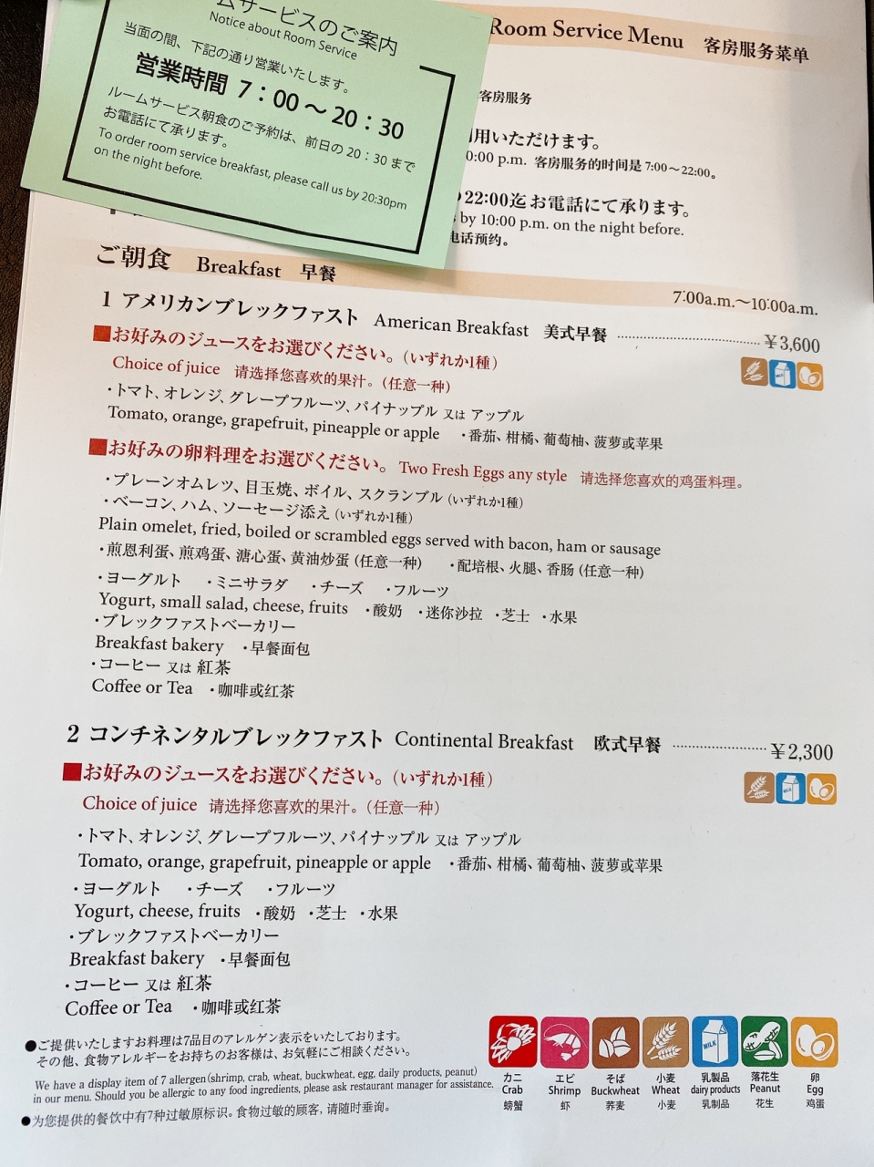 朝食はルームサービスでアメリカンブレックファストにしてみました。