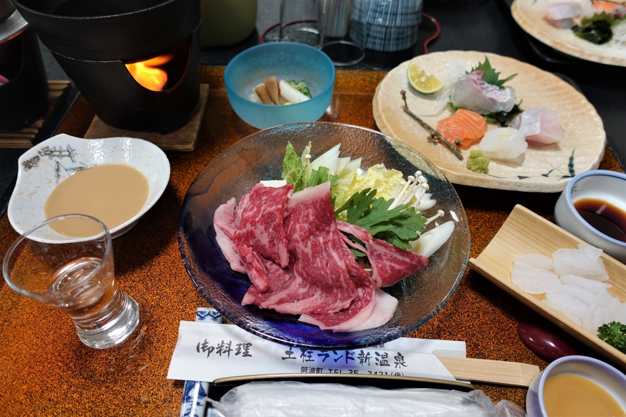 建物はちょっと見、あか抜けない感じなのですが、スタッフの方は皆さん優しくて、何より食事が美味しかったです。地元産の食材を意識しているとの事で、阿波牛も鳴門の鯛も、山くじらと呼ばれる刺身こんにゃくも、宿手作りの竹輪も、たらいうどんも堪能させてもらいました。