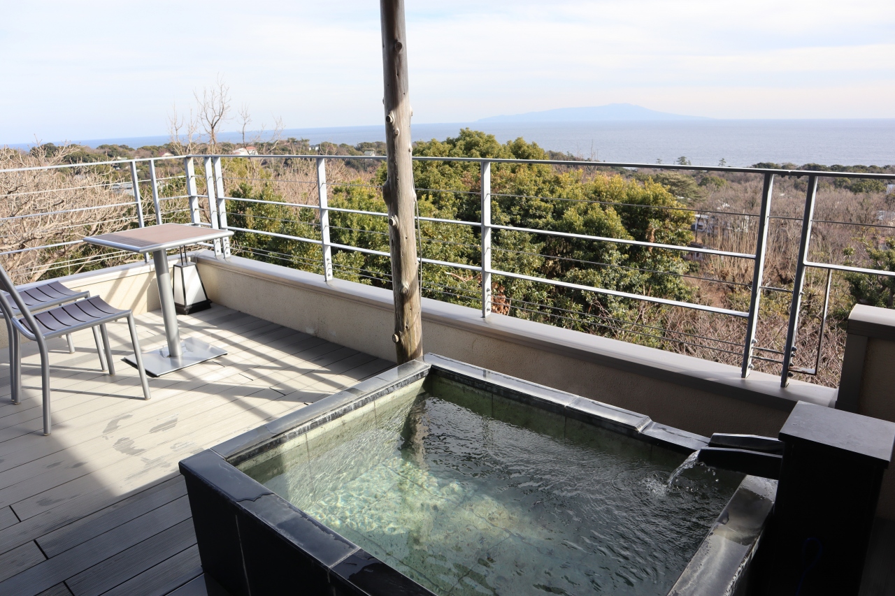 たった8室の温泉宿。今回、初めて利用しました。部屋ごとに造りが違うので、予約時から泊まる部屋が確定します。私たちは千尋という特別室に2泊しました。テラスには伊豆大島を眺められる露天風呂があり、眺望は最高。料理も、料亭顔負けの豪華懐石料理で、想像以上の滞在でした。そして、何よりもの特徴は「愛犬と泊まれる宿」であること。ペットと泊まれる宿は、どこか人間が我慢するような宿が多い印象でしたが、ここは人間だけでも大満足の滞在ができる上に、愛犬も一緒にいられる最高の宿でした。