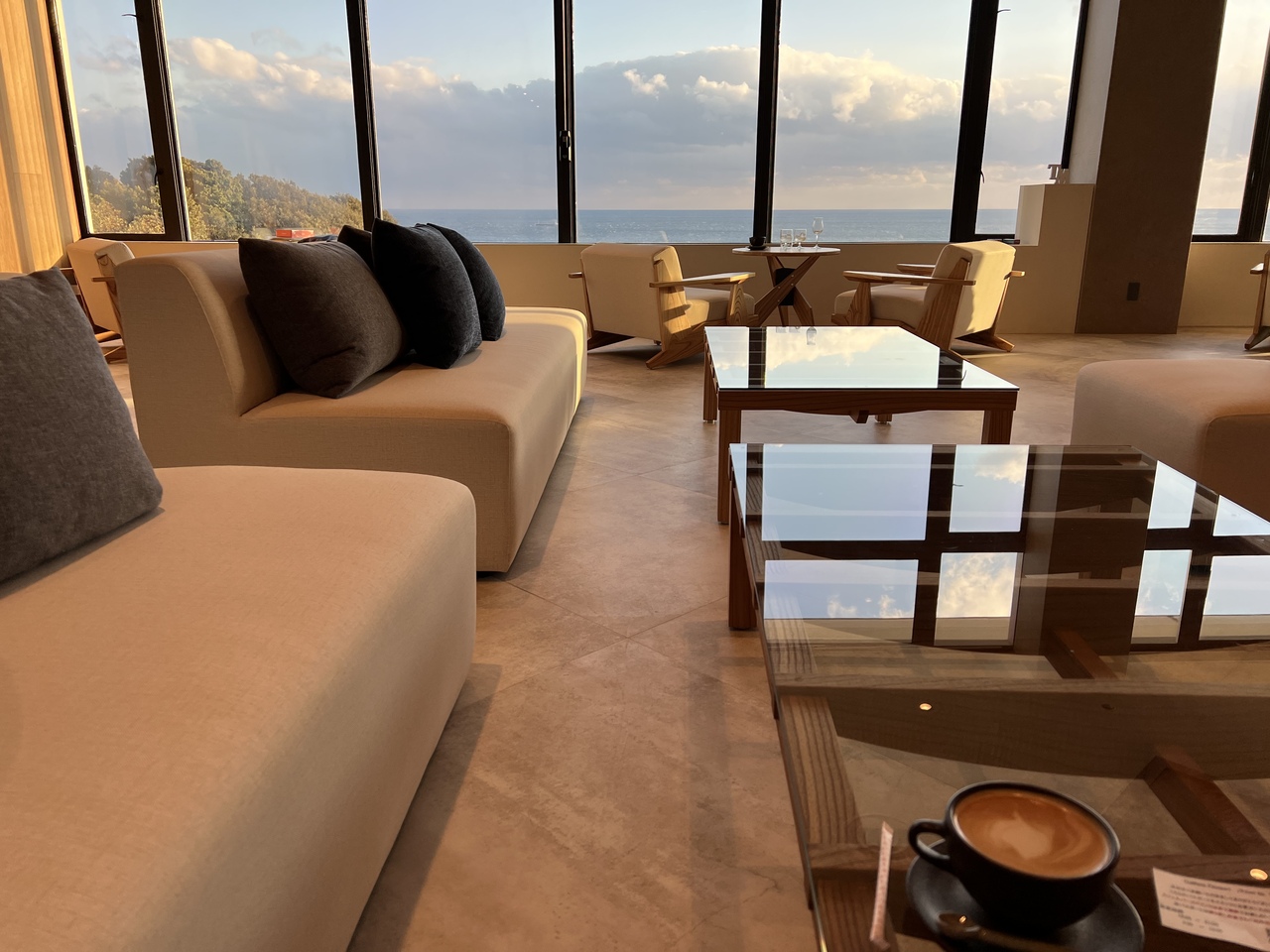 リゾートホテルとして生まれ変わっているように感じました。真っ白なロビーを抜けると海を望む広々としたラウンジがあります。センスの良いカフェがラウンジ横にあり、宿泊者にはチケットが渡され、フリードリンクになります。カフェラテやカクテルをいただきましたが、東京のカフェで出てくるようなこだわりの味でした。