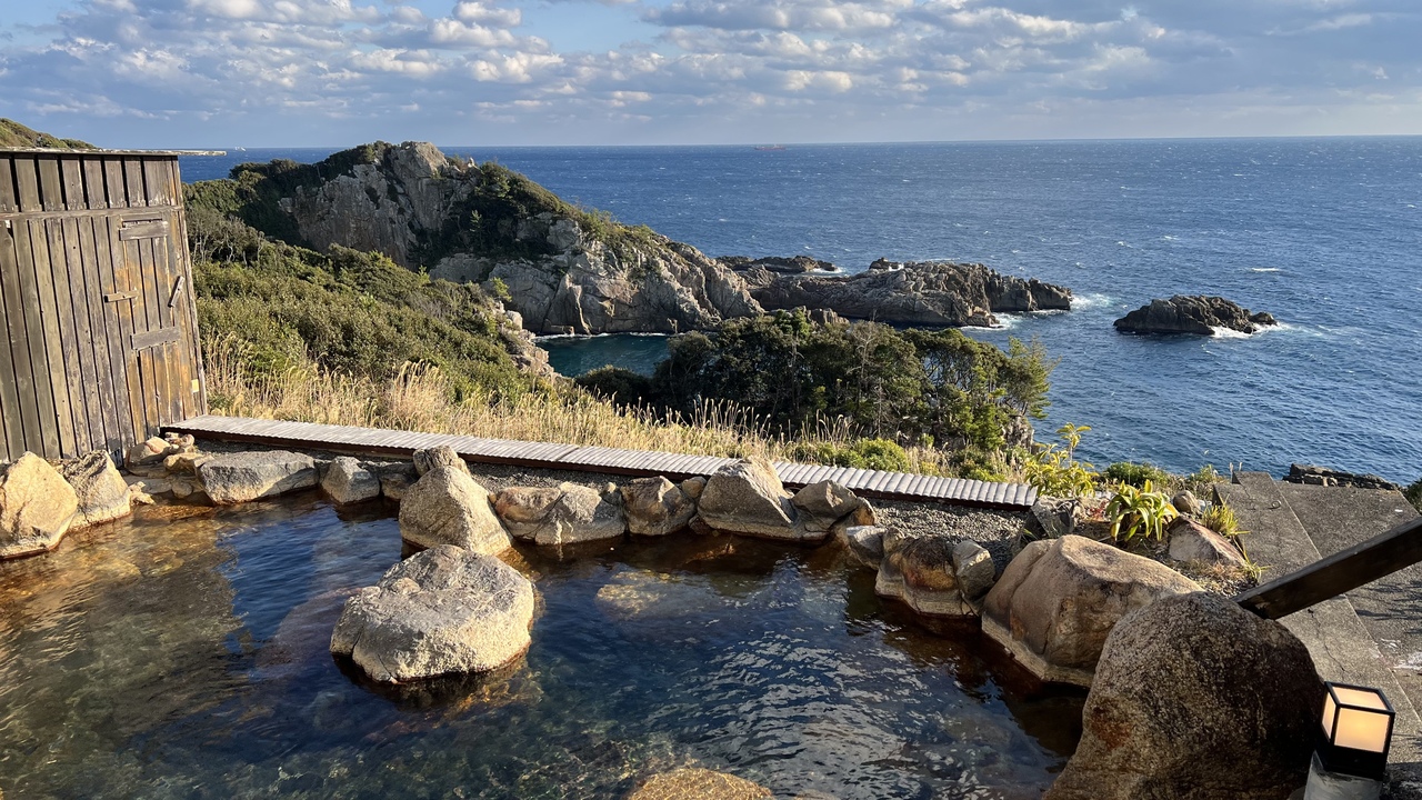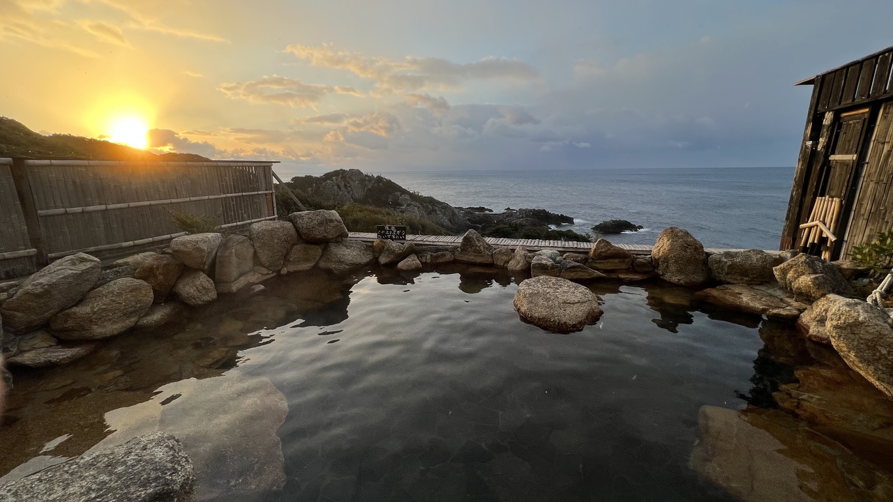 露天風呂は別館にあり、長い廊下と階段を使いますが、それでも何度も行きたくなる素晴らしい露天風呂でした。柵などの視界を遮るものがないので雄大な眺めを見ながらゆっくり浸かり、日の出も見ることができました。客室と大浴場の間に休み処があり、アイスキャンディーやドリンクがいつでもいただけるようになっていました。