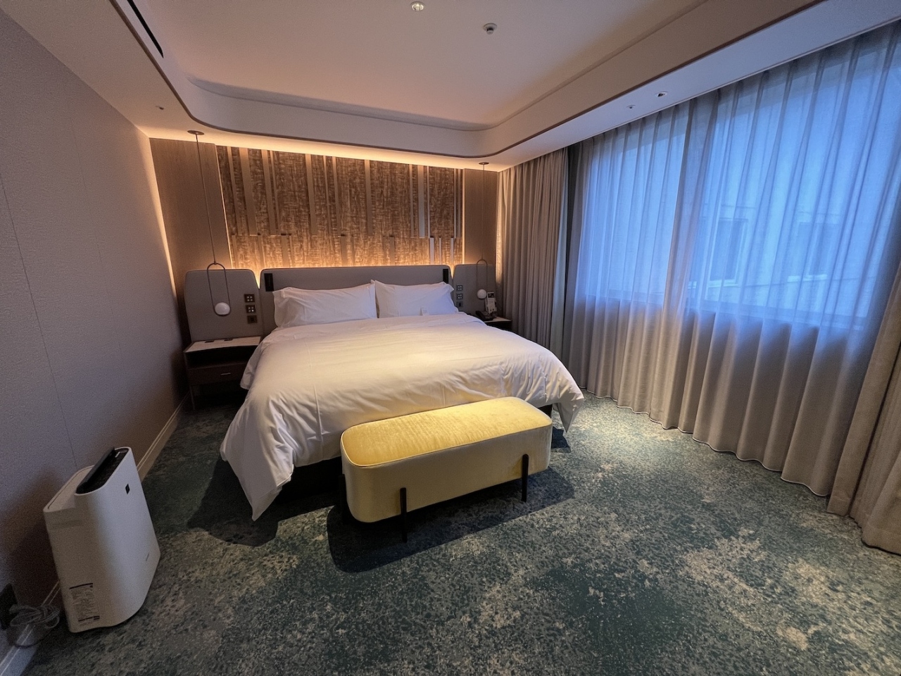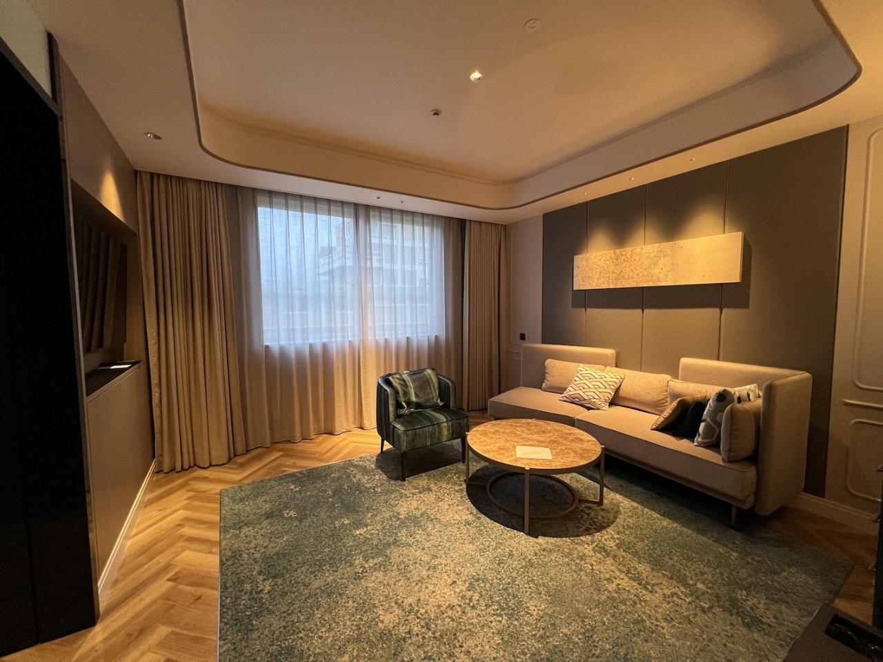 1キングベッドのジュニアスイートに宿泊しましたが、広々としたリビングスペースと落ち着いた雰囲気のベッドルームはセパレートになっており、バスルームは洗面ボールが2つあるのでお互い気兼ねなく使用できます。