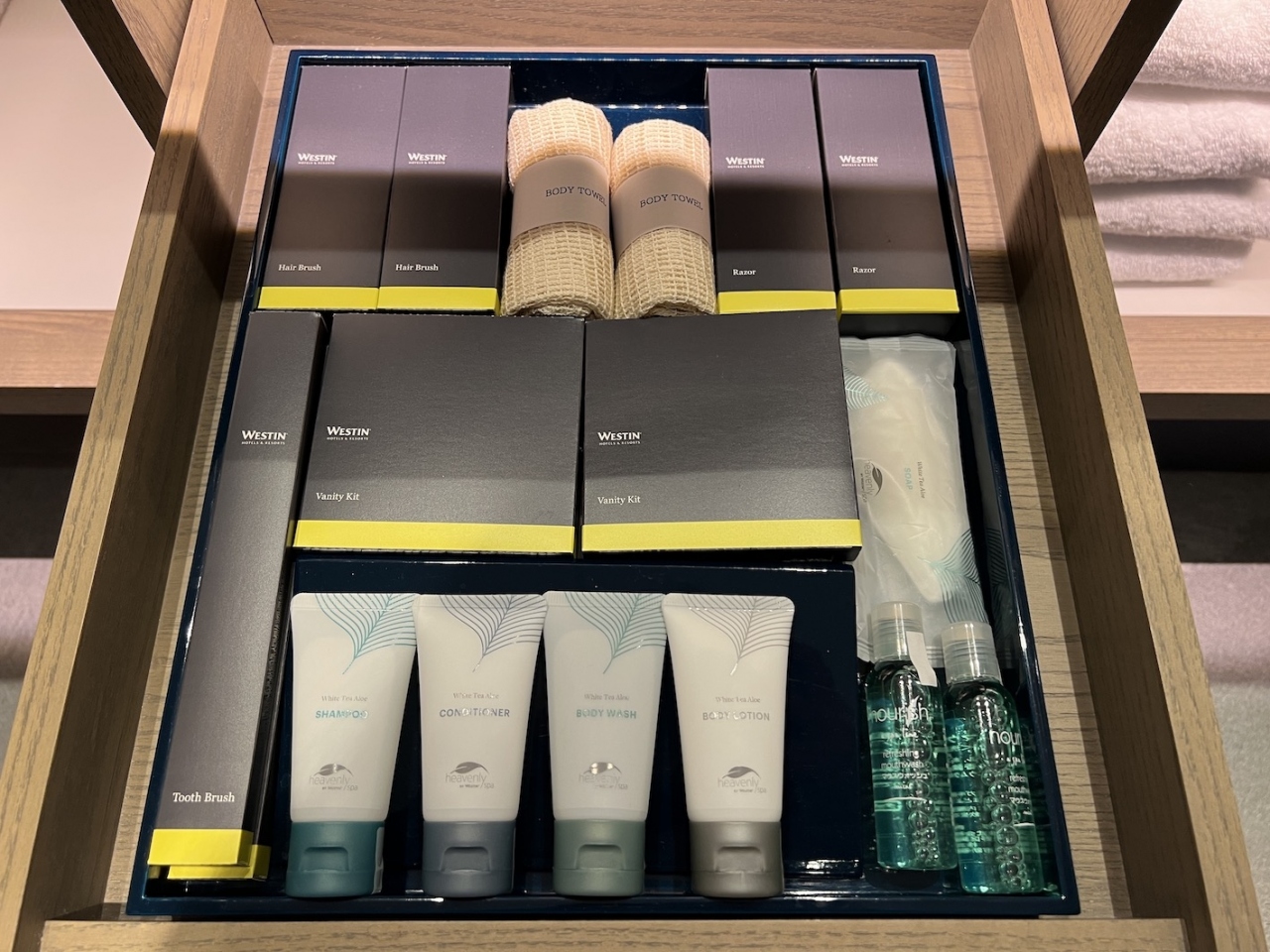 ウェスティンでは『ヘヴンリースパ』のホワイトティーアロエがデフォルトのアメニティですが、こちらのお部屋にはフランスのブランド『ソティス』のものも置かれていました。
