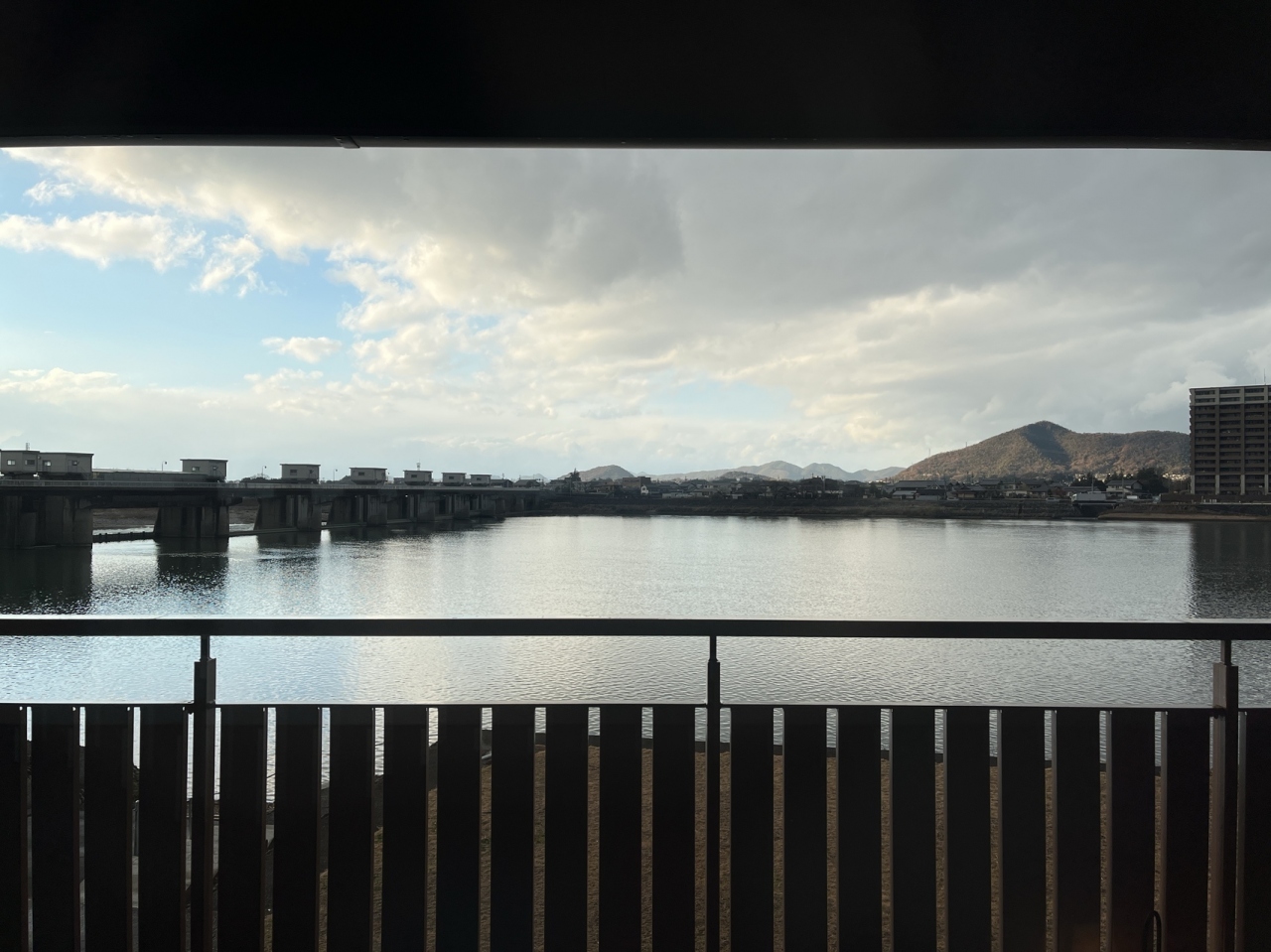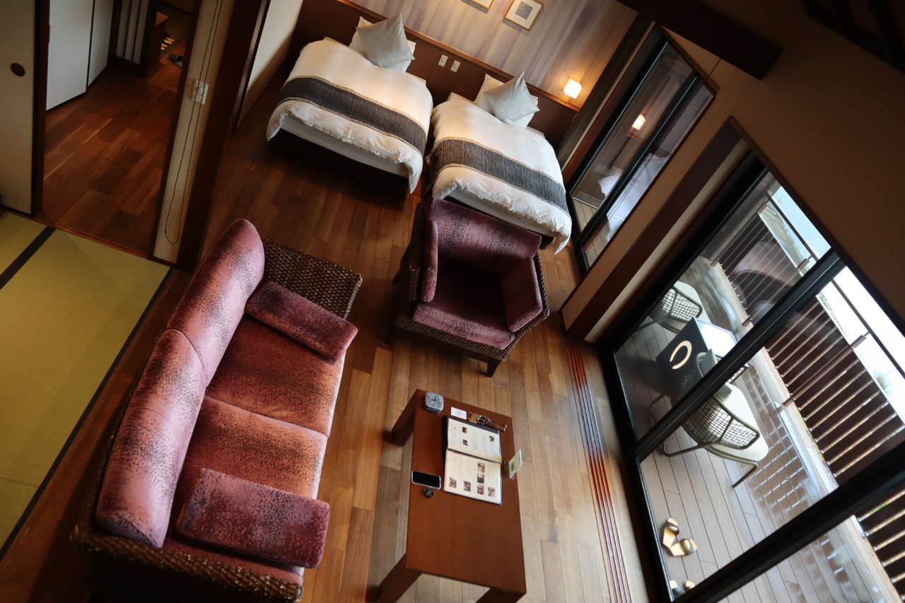 露天風呂付きの客室はメゾネットタイプになっていて一階のベランダからは木曽川、二階からは犬山城の眺め。冷蔵庫内の飲み物はフリーでした。