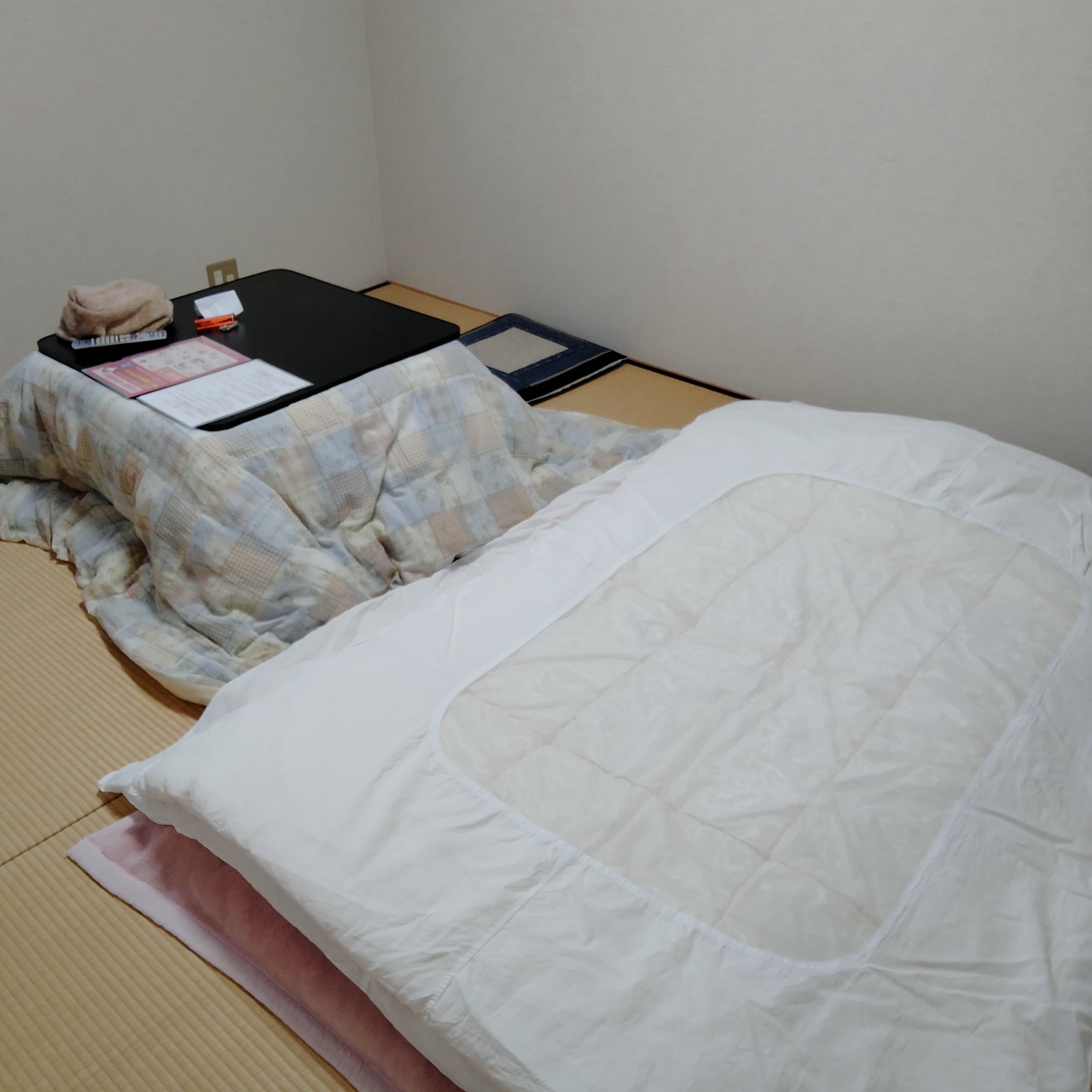 4畳半程度の和室にはタオル/歯ブラシ/浴衣+こたつがあり、一人で泊まるには十分でした。