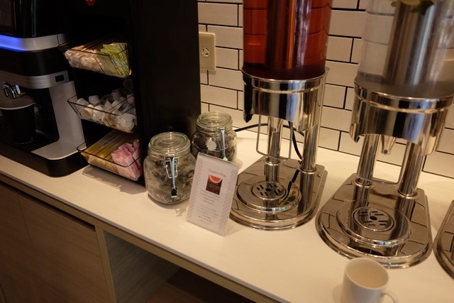 1階にはラウンジがあってコーヒー以外にもシンガポールスリング風味のお茶という珍しい飲み物も自由に飲めます。ちょとだけお菓子もあります。1500円ほど高い部屋の高層階宿泊者専用のラウンジもあって、そちらはアルコールも飲み放題です。