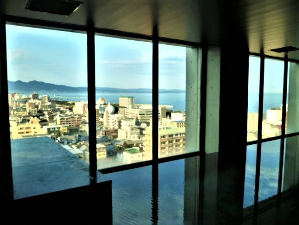 TVで別府/湯布院温泉を放送されているので[別府温泉]に来ました…駅付近/山の中腹=高台/別府湾の直ぐ側を探しておりましたが(3泊4日)、先ずは2021年12月4日グランドオープンした[アマネク別府 ゆらり2泊]に! 別府は伝統の竹細工が有名ですが、竹細工からの木格子と白い□鋼材の組み合わせを外観に/ロビーも♪ 大浴場と屋上に温泉プールで別府全貌が一望できる(^^) 部屋は10Fで視界は高崎山が見えました/大型TVも気が利いています/窓付きのお風呂です。