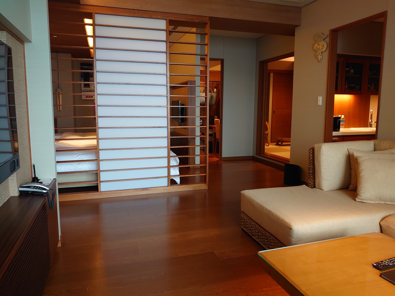 お部屋はベットルーム、リビング、和室に広いウォークインクロゼットと洗面所、お風呂は半露天風呂で掛け流しの温泉と新しくてキレイで広いです。