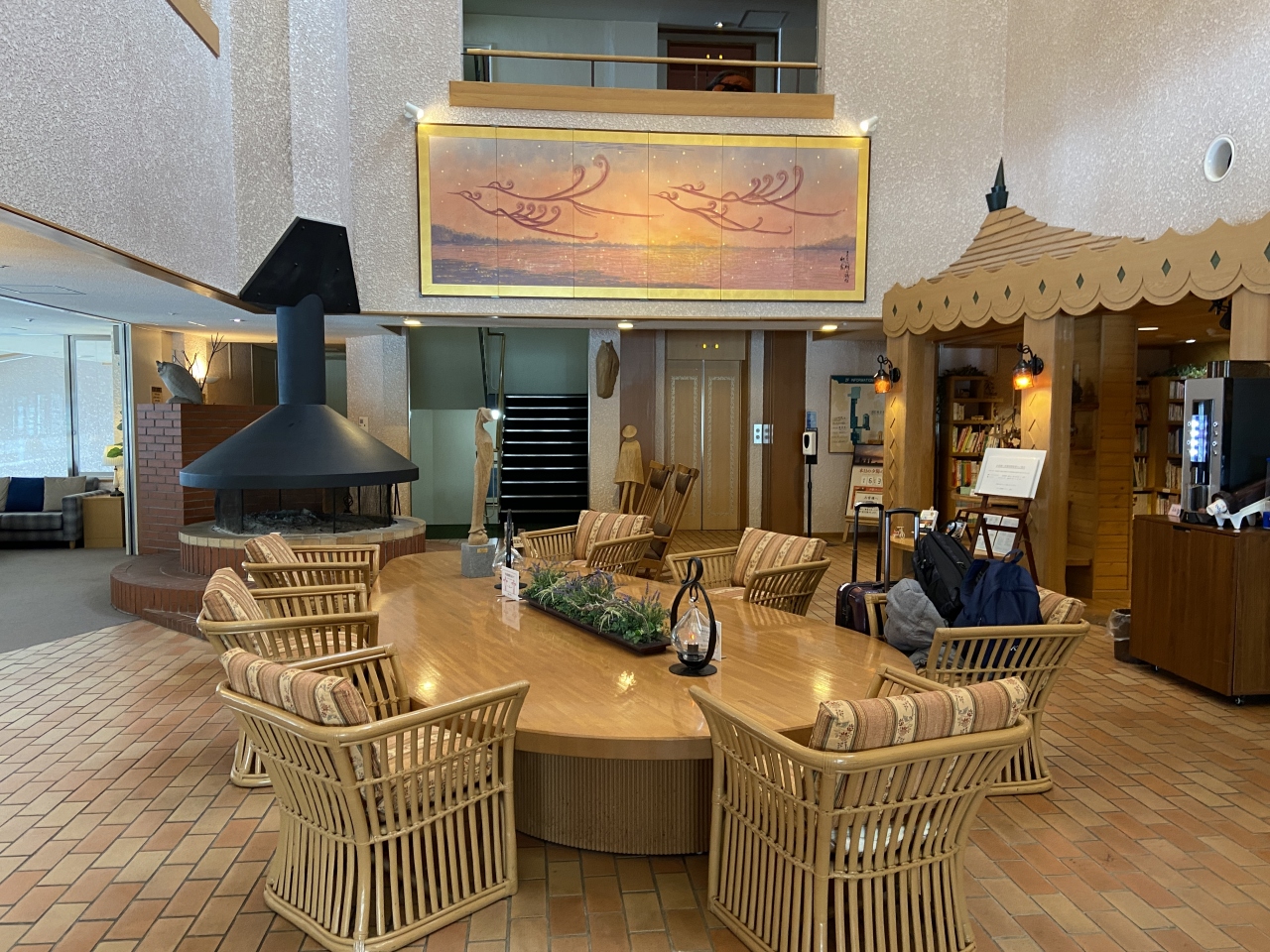 ちゃんと正面から入っていれば開放感のある吹き抜けのロビーに温かみのある大きな木のテーブル、そして立派な暖炉と雰囲気はいいのでしょうが、入り口を間違えたせいで印象はがた落ち・・