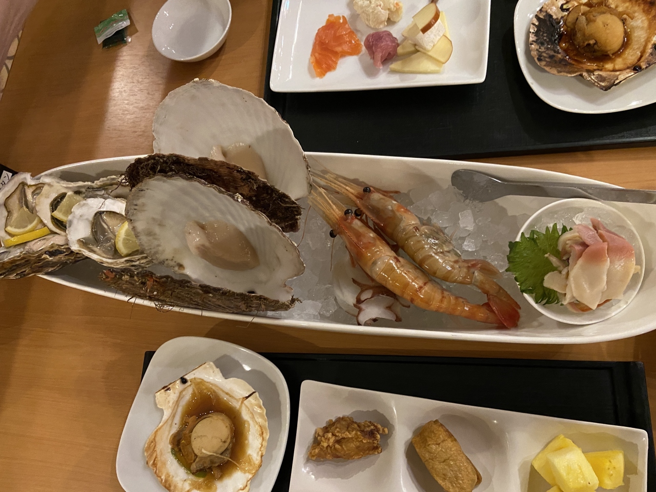 でも夕飯のメインディッシュの季節の海鮮盛り合わせは、大きなお皿にこれでもかと新鮮な海の幸がのっていて、生カキはあまり得意ではない私でも美味しくいただきました。