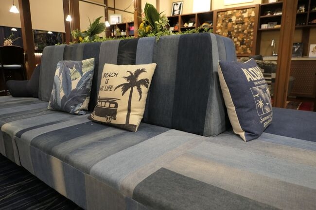 一覧を見るロビーラウンジはジーンズをリメイクしたインテリアが素晴らしい♪
