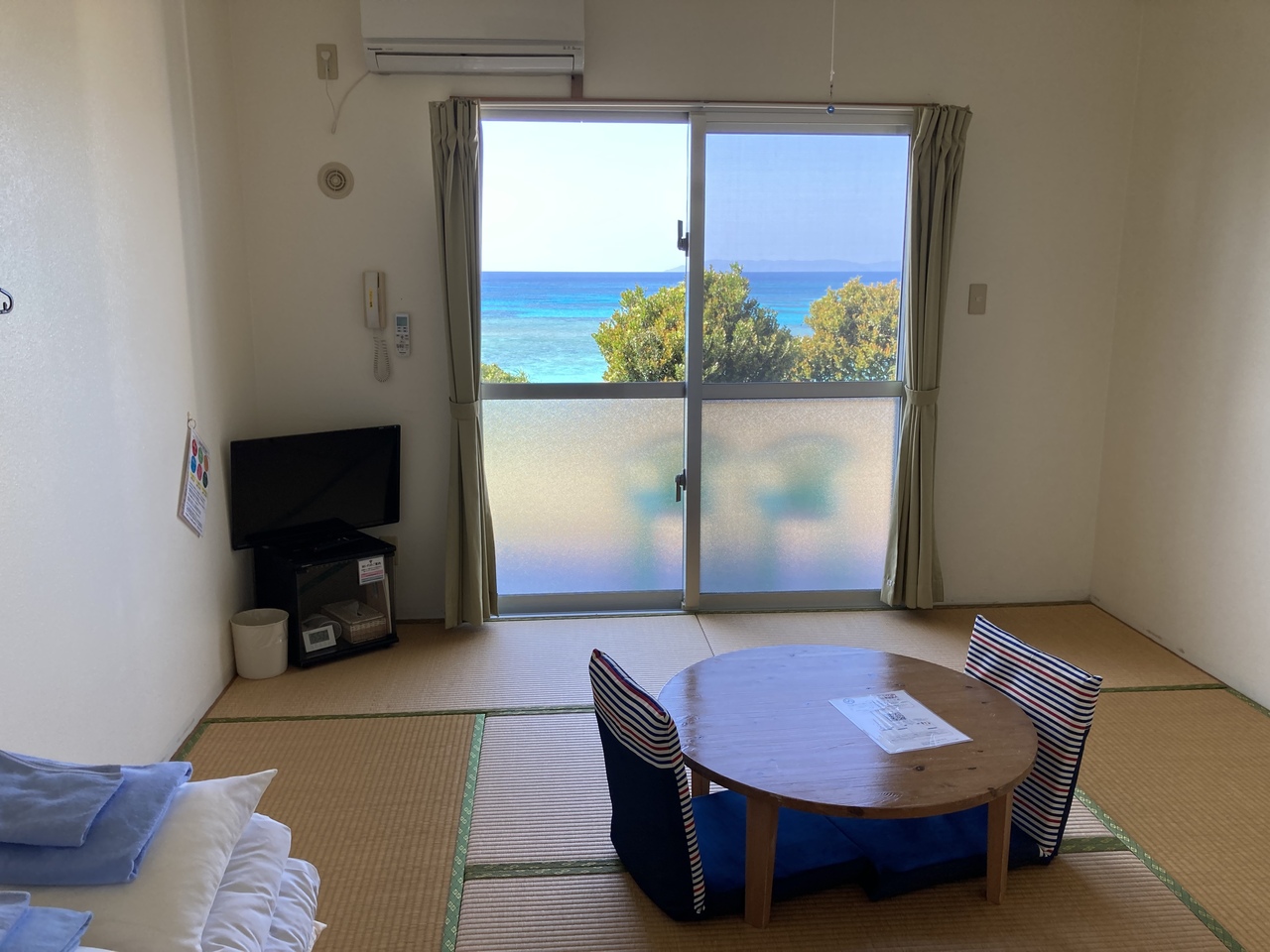 ニシ浜の真ん前にあり、お部屋から波照間ブルーが見える最高の立地です。1階の和室に宿泊しましたが、テラスに出ると木々の合間から素晴らしい海が見えました。