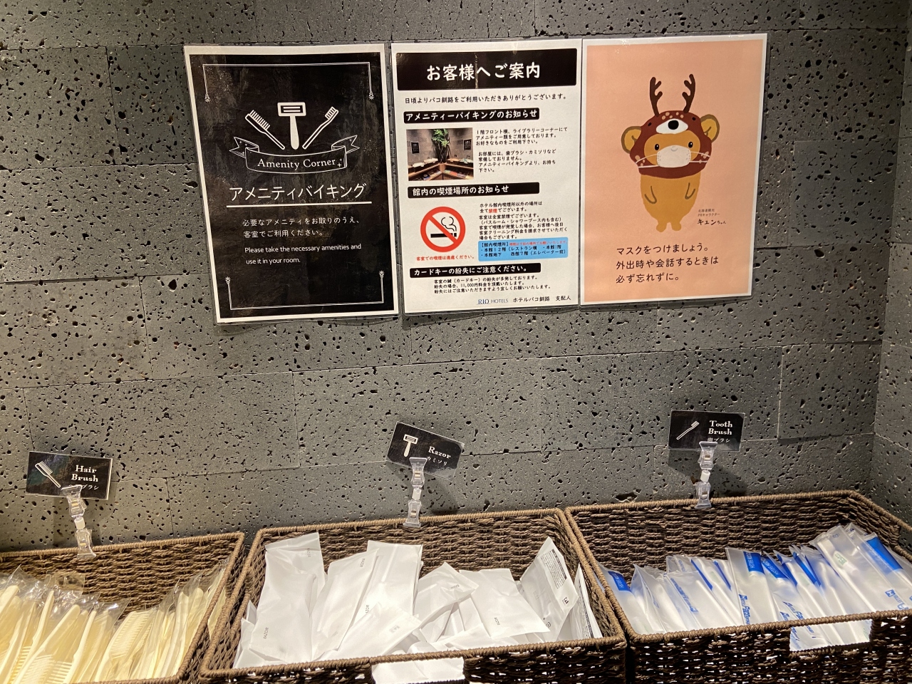 部屋は広くはないけれど空気清浄機もあるし合格ライン。アメニティはなんとフロント横のアメニティバイキングで自分で必要なものをいただきます。