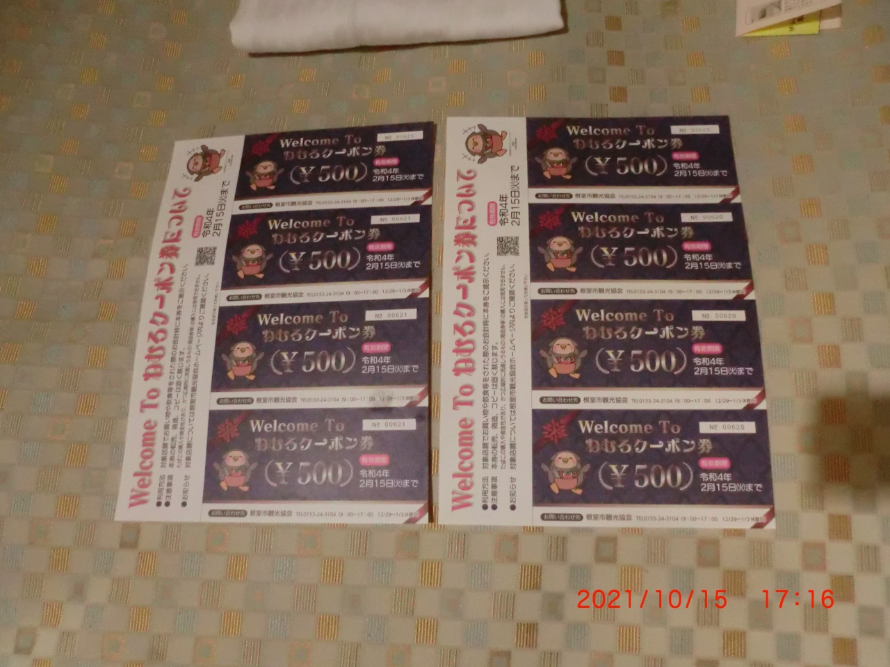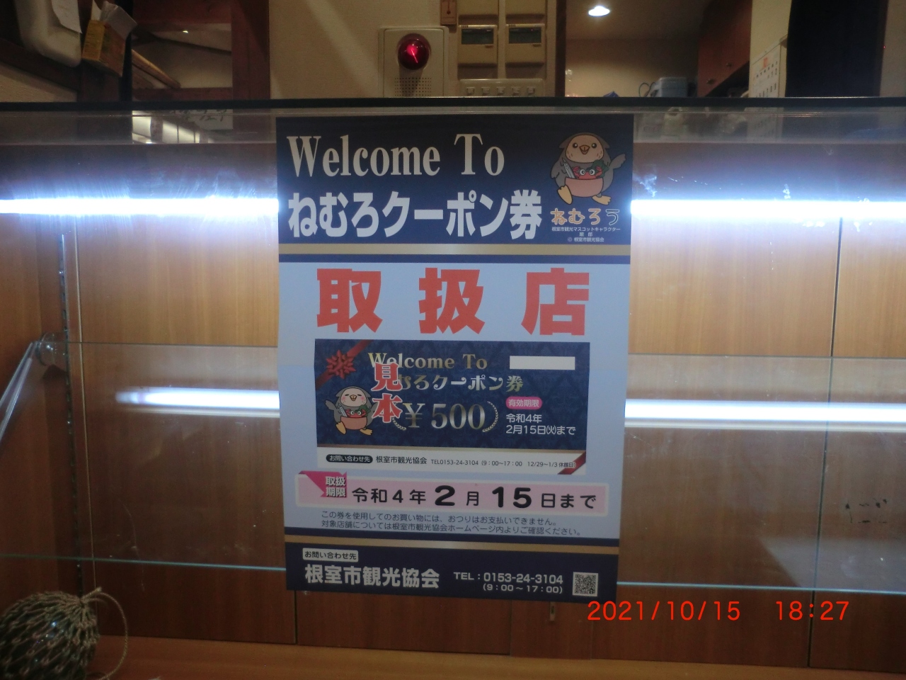 チェックイン時に「根室クーポン」を一人2000円分もらえ、夕食の寿司屋さんで上手く使えました。