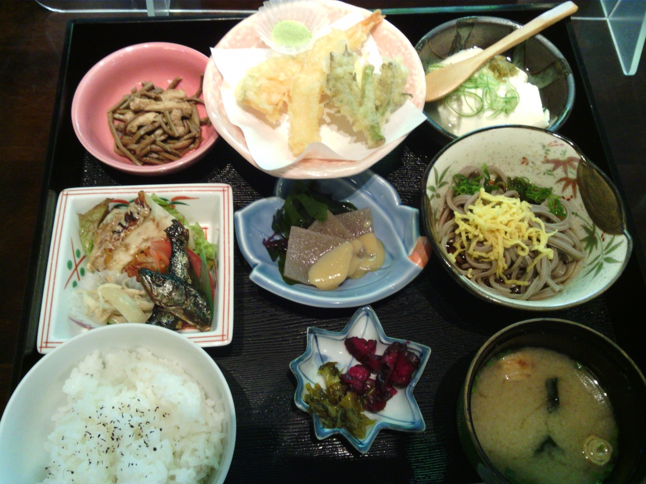 茶蕎麦、天ぷら、豆腐、山菜、サラダなどいろいろな料理が少しずつ入っています。いろんな味が楽しめ、またトータルでみるとボリュームも十分あって満足できました。特に手作り豆腐は濃厚で柚子胡椒とおよくあい、美味しかったです。これで税込み1200円はお得だと思いました。