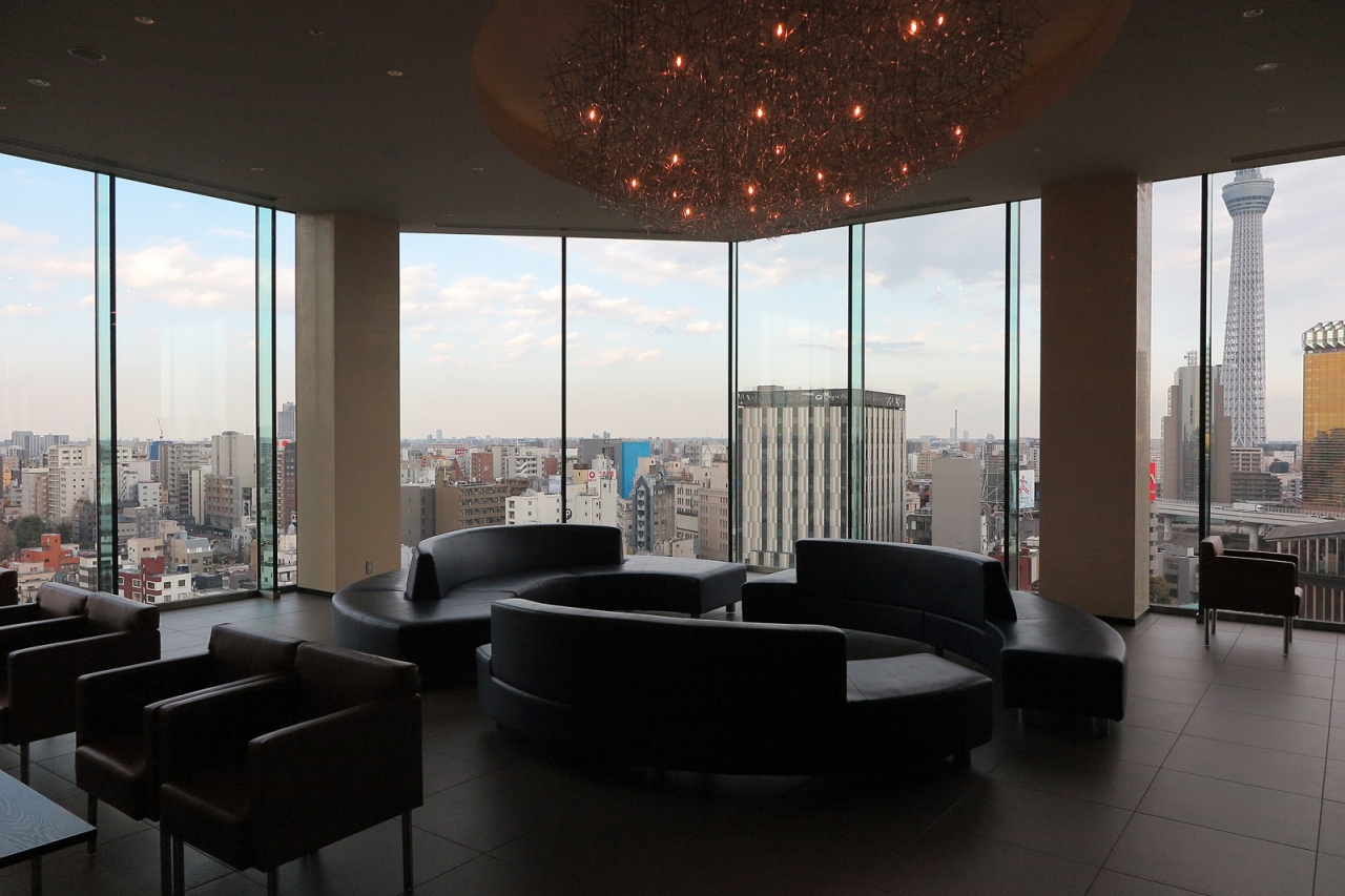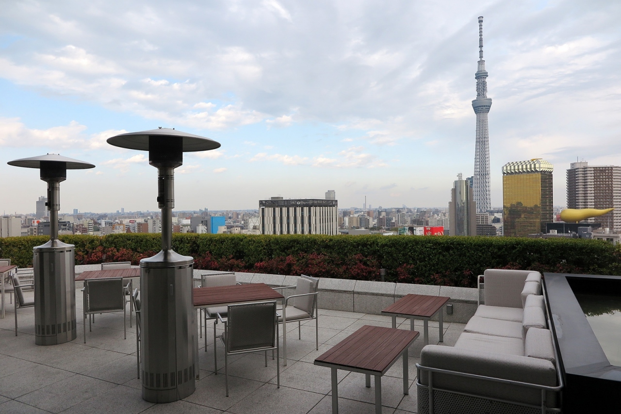 こちらのホテルでワクワクすること。①玄関を入ったウェルカムロビーの香り、そして天井に設えられた水槽を通して揺らめく間接照明。②13階メインロビーの大きな窓から眺める浅草の街並み。③14階にある宿泊者専用テラス&バー、素晴らしい景色が楽しめます。④高級感はないものの品のある客室はゆったり寛ぐのにぴったり、コーヒーマシンも良い脇役。⑤エッセンシャルタイプのバスルームは洗い場付き、外光も入ります。⑥13階レストランのテラス席で夜景を楽しみながらの食事、料金も良心的だと思います。