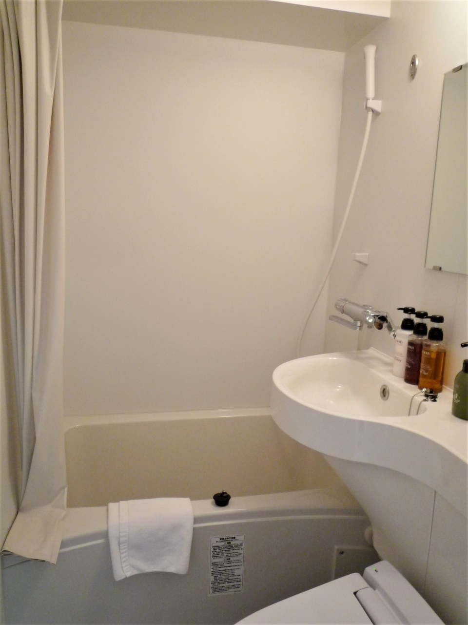 トイレ&バスルームもユニットタイプでバスラブはちょっと狭過ぎかも?…、せめて足が伸ばせるほどの広さは欲しいですね(洗濯物干しロープは付いてます)。