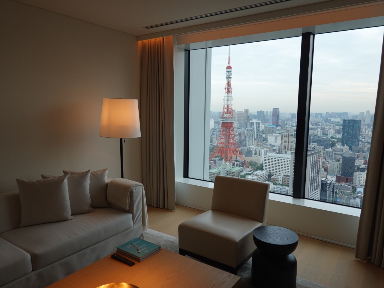 虎ノ門駅近く、開業したばかりの東京エディションホテルを利用しました。天井の高いロビーには観葉植物も多く配置され、豪華さの中に落ち着く雰囲気があります。エレベータホール前の壁にはには、モノトーンのおしゃれな写真が並べられていて、スタイリッシュな感じです。部屋に入ると、目の前に東京タワー、テーブルには、果物と胡蝶蘭、メッセージカードがおかれていて、おもてなしに温かい気持ちになりました。