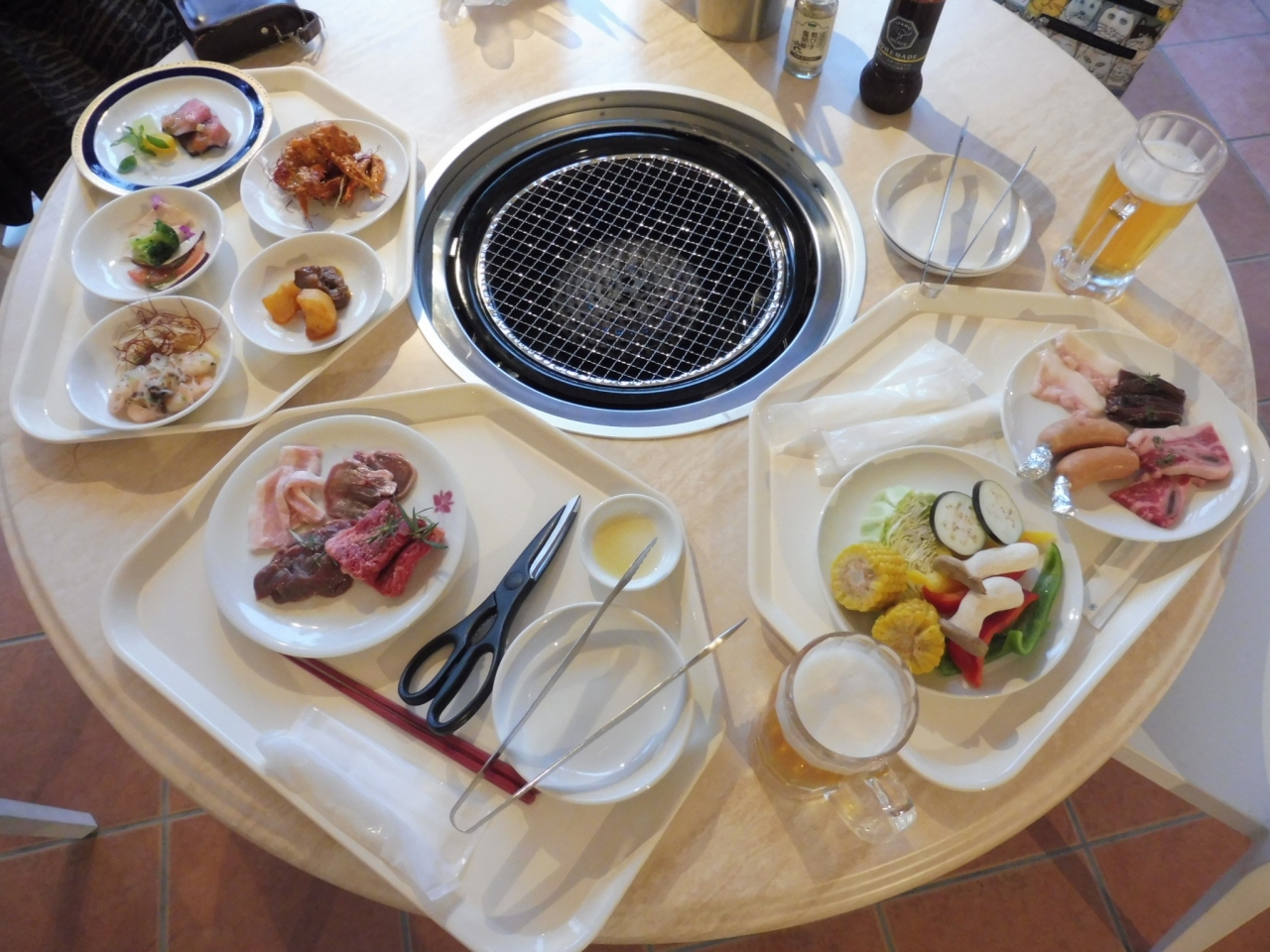 夕食はバイキングで、室内席での通常バイキング(カニあり)か、テラス席でのバーベキュー(カニなし)を選べます。