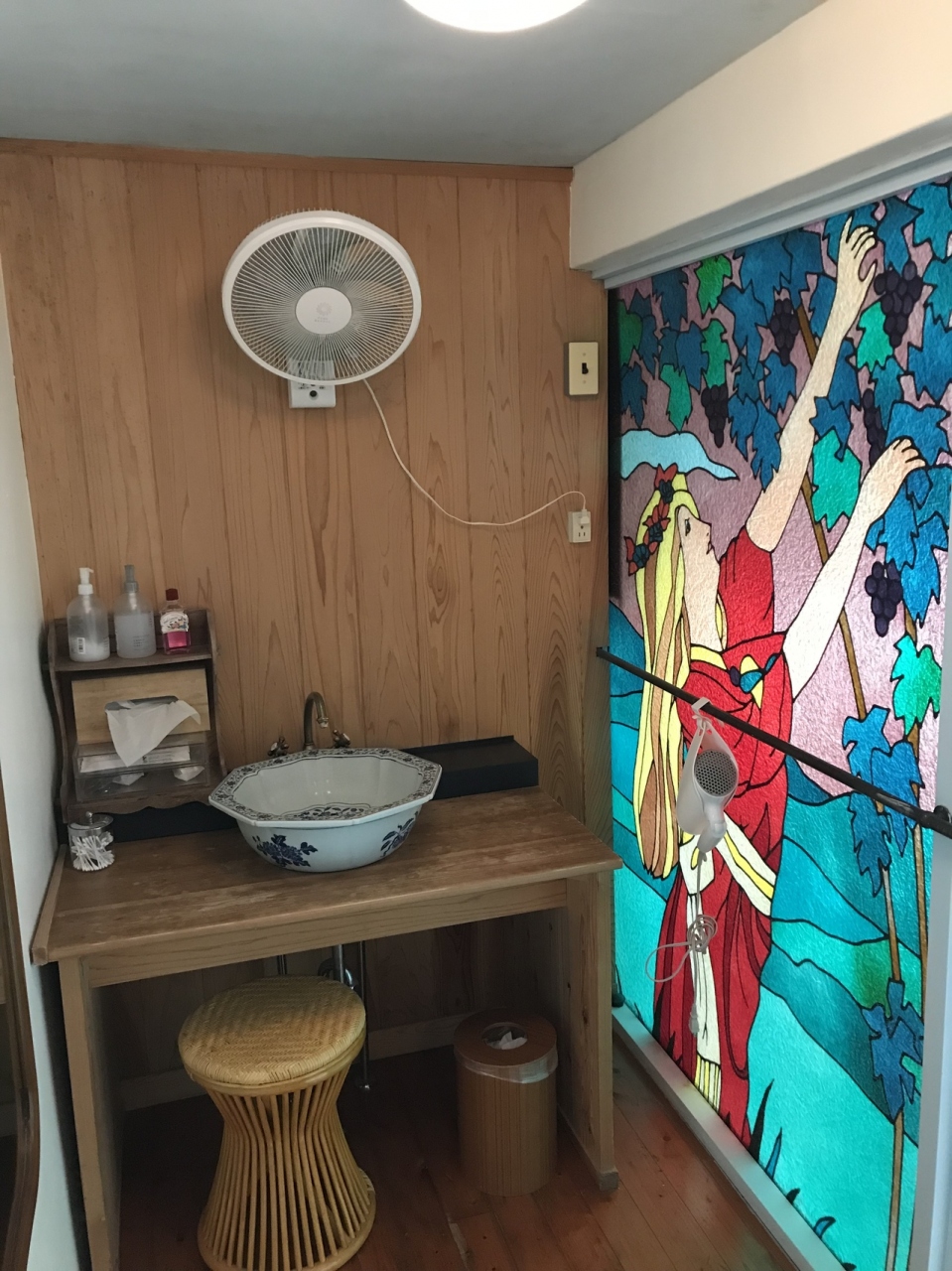 浴室には、ハーブのシャンプーやトリートメントが備えられていて、ステンドグラスもあった。
