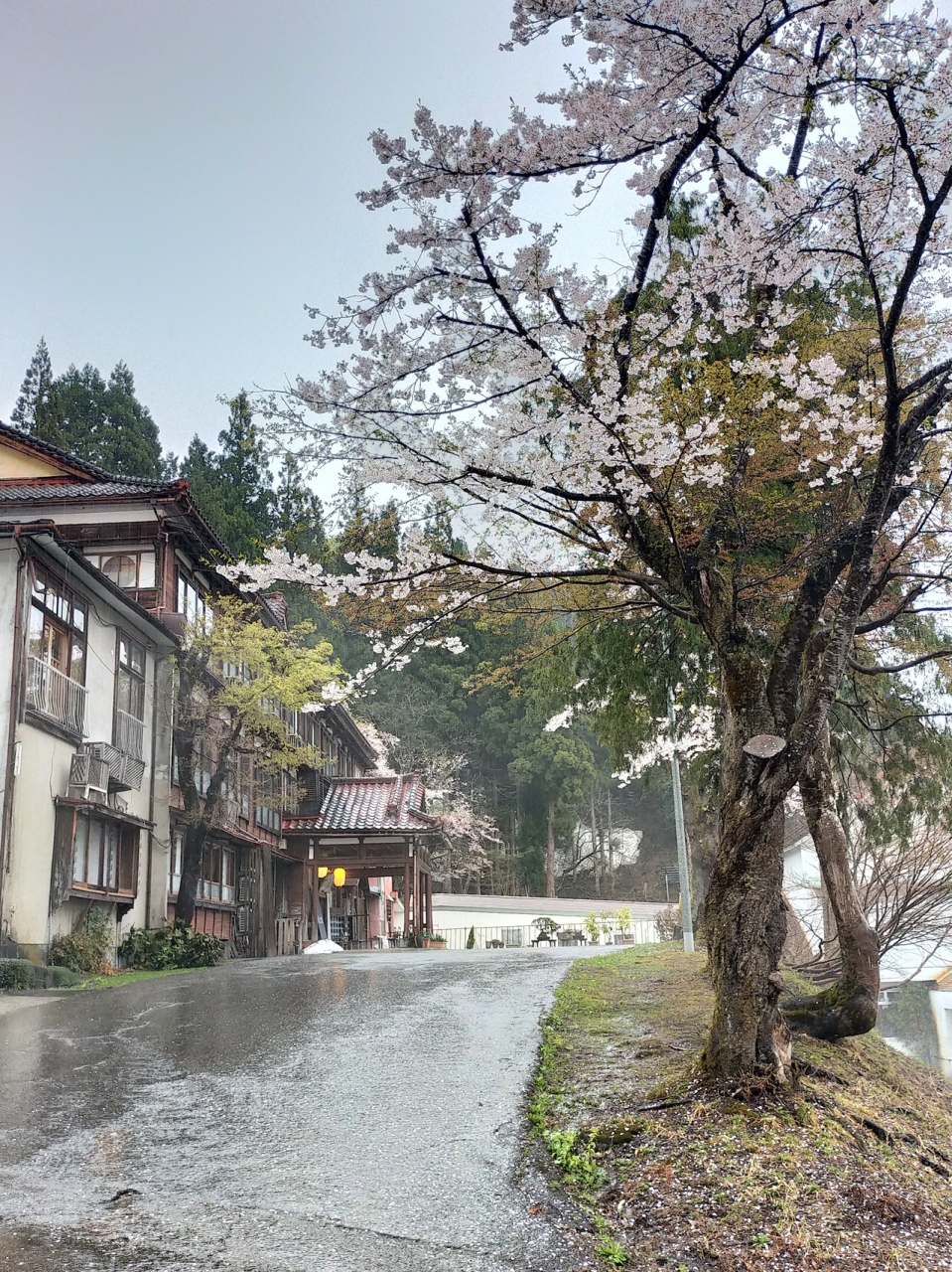 本館は三階建の重厚感ある木造建築です。お風呂と食堂は別館があり渡り廊下でつながっていました。カタクリのおひたしなど、山の幸が豊富で食事も美味しかったです。ちょっとみどりがかった薬湯の温泉は、塩辛い濃厚なお湯でした。桜と残雪も綺麗でした。