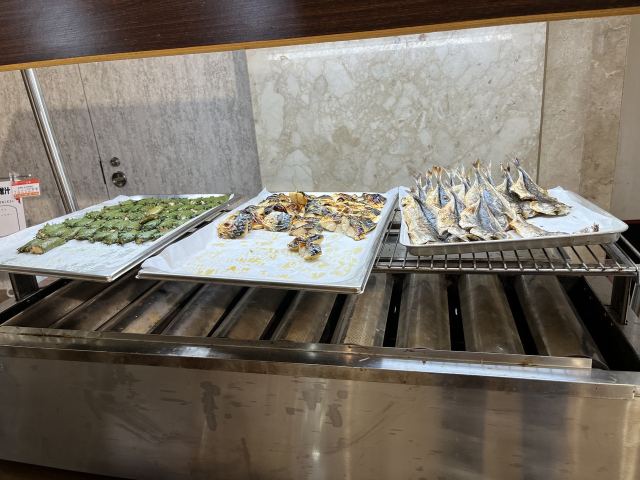 お刺身、ステーキ、シチュー、鯛飯等豪華な夕飯に朝は栄螺カレー、あじなど海鮮ものも、豊富なバイキング