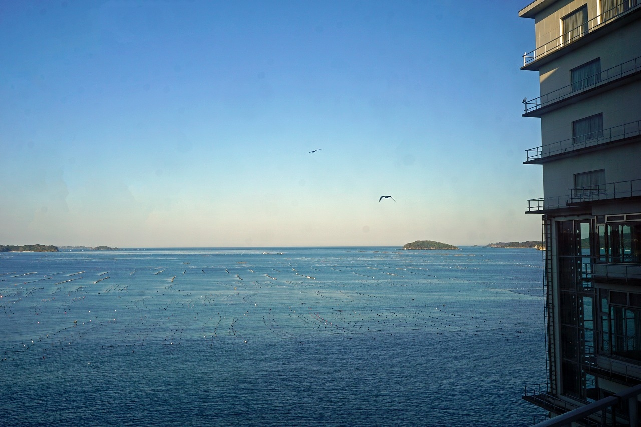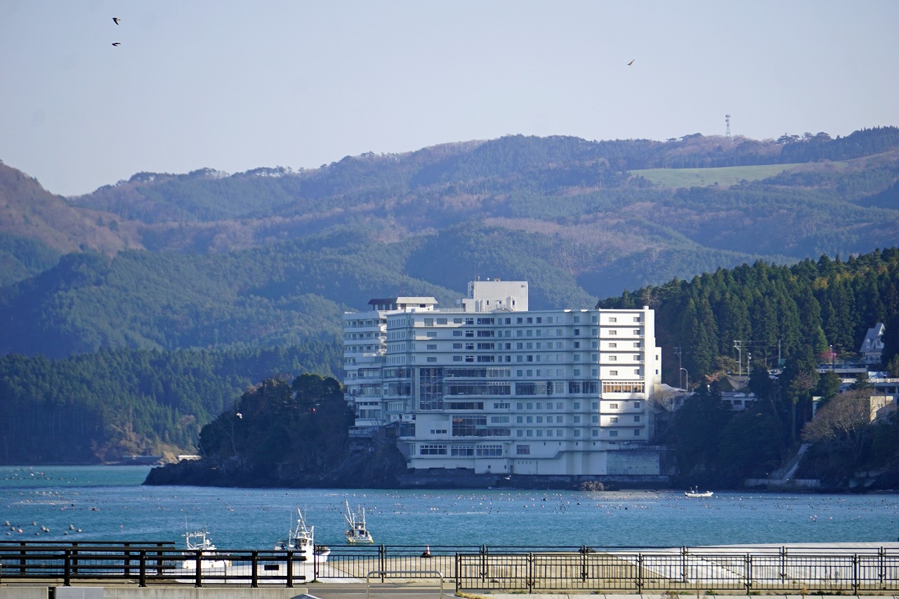 三陸海岸の周遊ツアーで宿泊しました。南三陸町の町から志津川湾を回り込んだ少し先にあります。高台の岩の上に建っていますが、東日本大震災時には3階まで津波の被害を受けたそうです。館内に入ると海側はガラス張りで、どの階にいても海がきれいに見えます。客室も志津川湾に面しているので海が見え、手摺にはウミネコが遊びに来ます。大浴場も1面ガラス張りで浴槽からも海が見えますし、表の露天風呂からも雄大な景色が見えます。サウナでさえガラス張りなので開放感があります。お湯の量も豊富で気持ち良かったです。食事はツアーの会席料理でしたが、アワビの踊り焼きなどの趣向も良かったです。仲居さんをはじめホテルのスタッフの方も親切でした。一番の思い出は翌朝の日の出の美しさですが、これは天候次第なので見ることが出来たらラッキーだと思います。10階から非常階段を上がって屋上に出られるので、星を見たり日の出を見たり楽しめます。