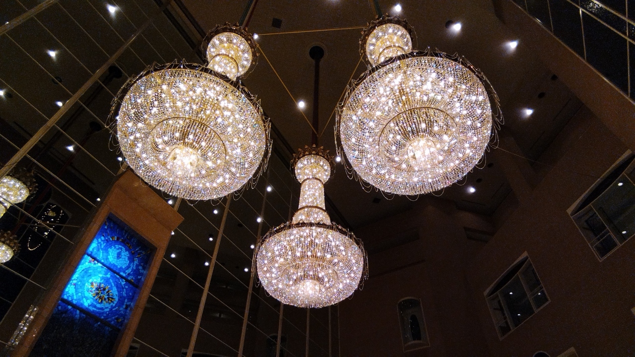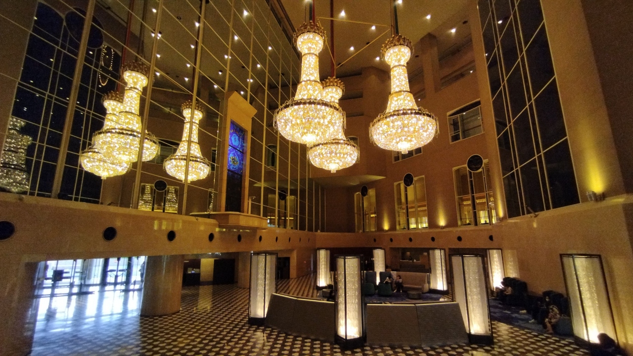 エントランスに一歩足を踏み入れると広々としたロビーが広がり、吹き抜けの天井にはハイアット リージェンシー 東京を象徴するスワロフスキー・クリスタル約11万5,000個が散りばめられた豪華な3基のシャンデリアが創業当時から現在まで変わらず輝き続けています。