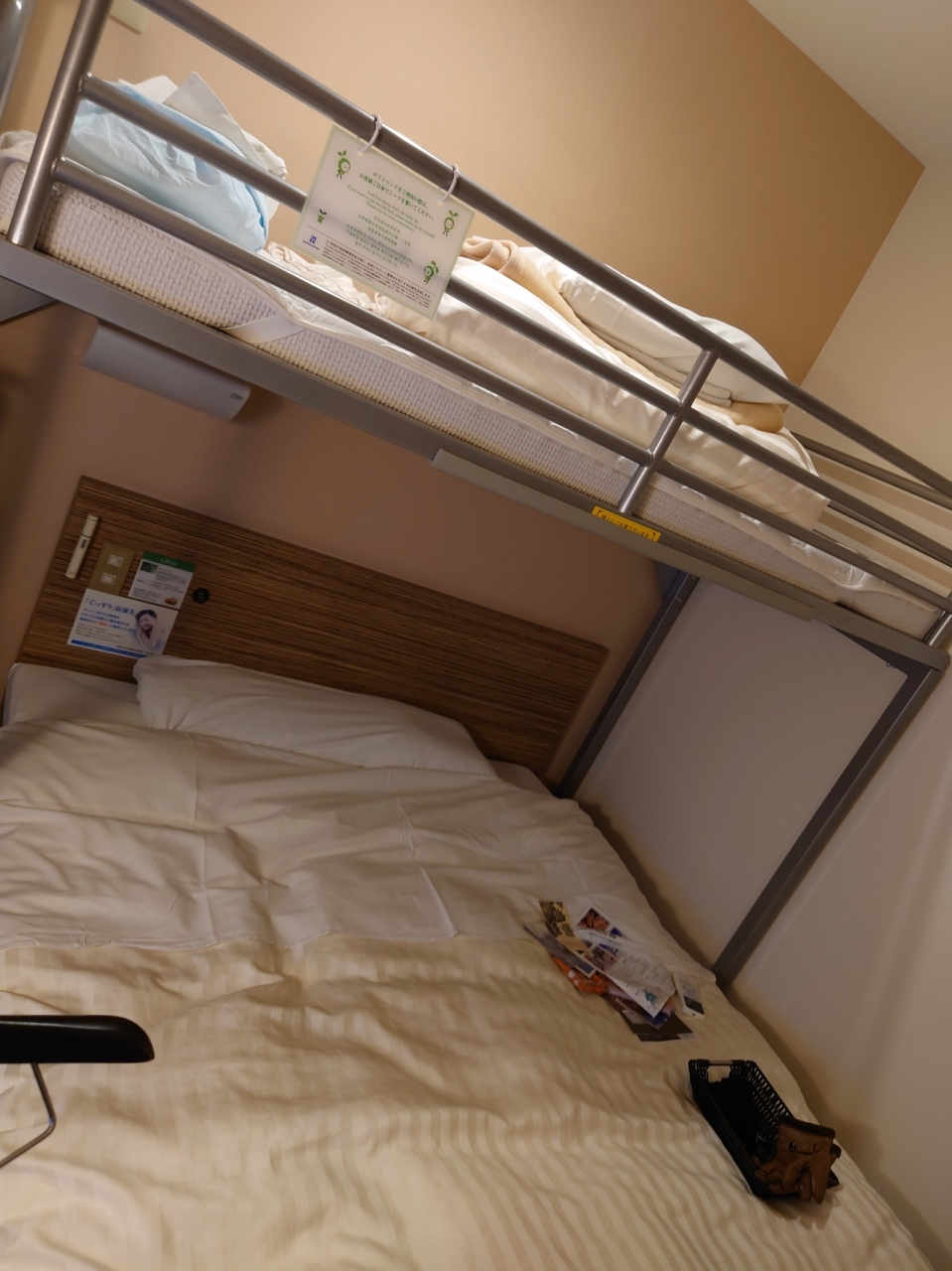 弘前さくらまつりを見るため宿泊。設備はキレイだが、二人で泊まるには狭すぎた。2段ベッドの上で寝ましたが、ゆっくりは眠れなかった。温泉があるのは良いが、イベント時期という事もあり、入浴の順番待ちの列ができていた。でもスタッフの動きや対応はテキパキしているので、通常泊まるには全然問題ないと思う。