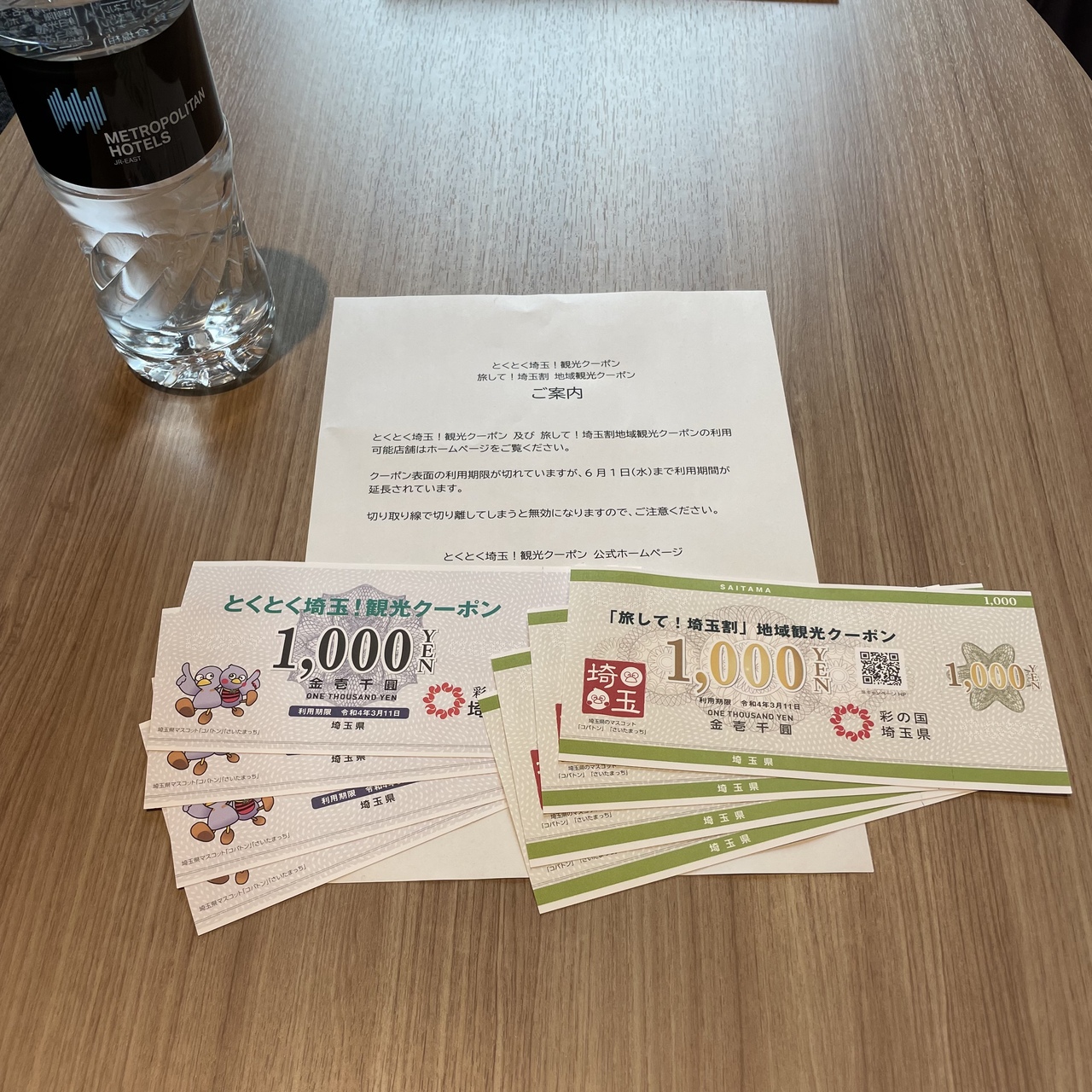 + 「旅して!埼玉割」2000円と、更に「とくとく埼玉!観光クーポン」の2000円の両方が紙クーポンで、チェックインの際にフロントで頂けました!!