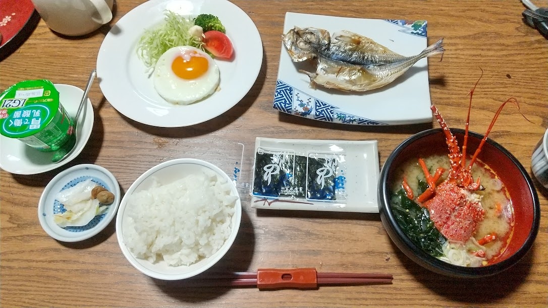 食事が充実した宿で、今回は、県民割利用なので、10500円の伊勢エビ付き贅沢プランにしたので、房州海老刺身、魚刺身、野菜天ぷら、イサキ煮魚、煮物、サラダ、釜飯、味噌汁、香の物、フルーツと充実の品でした。伊勢海老は翌日の味噌汁に具足煮として出されました。
