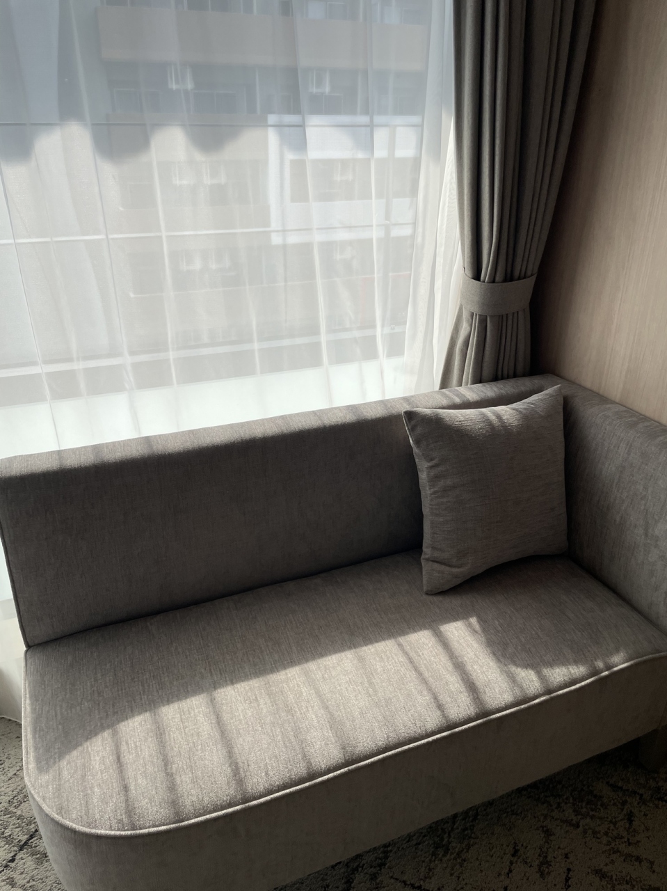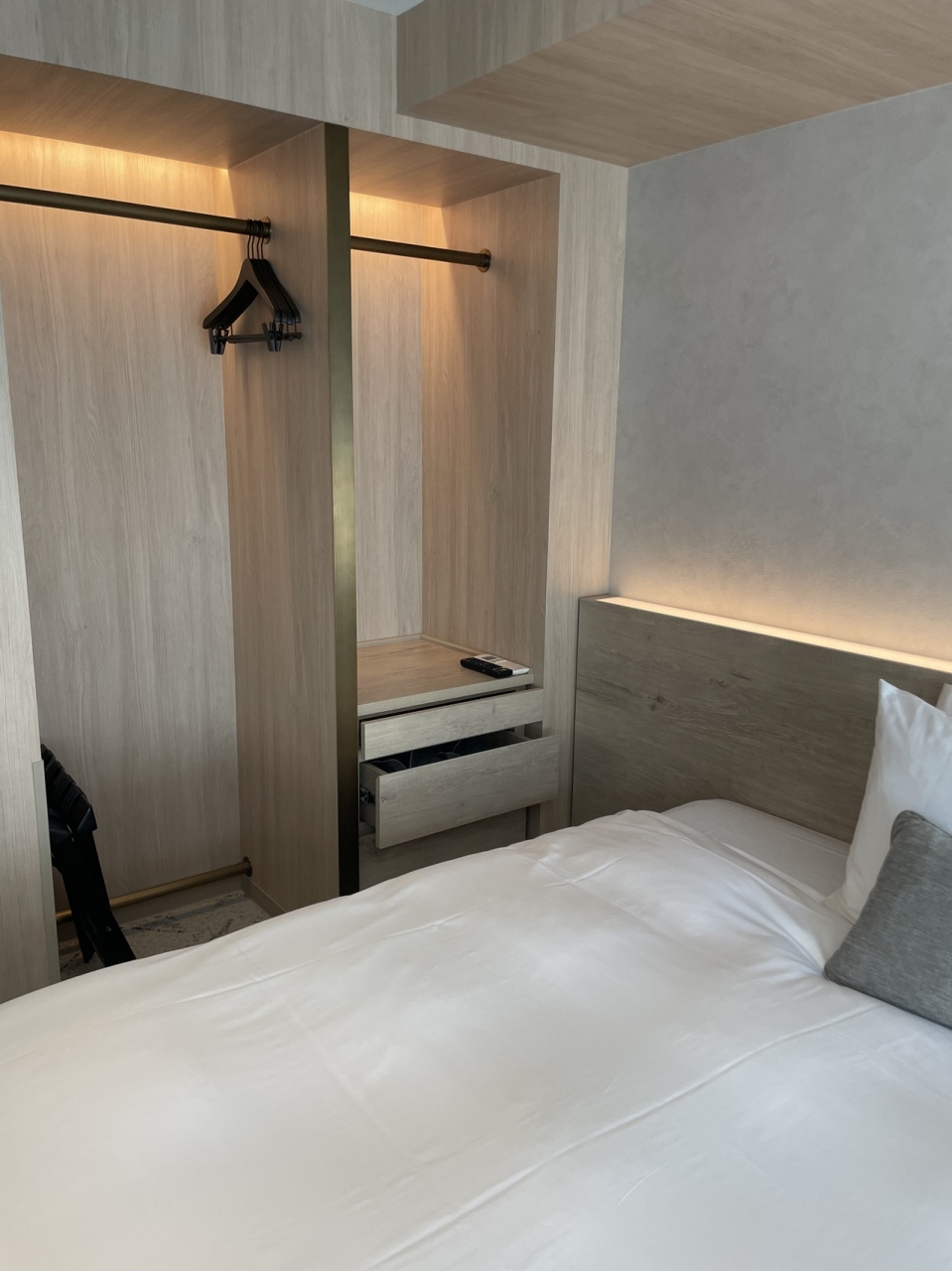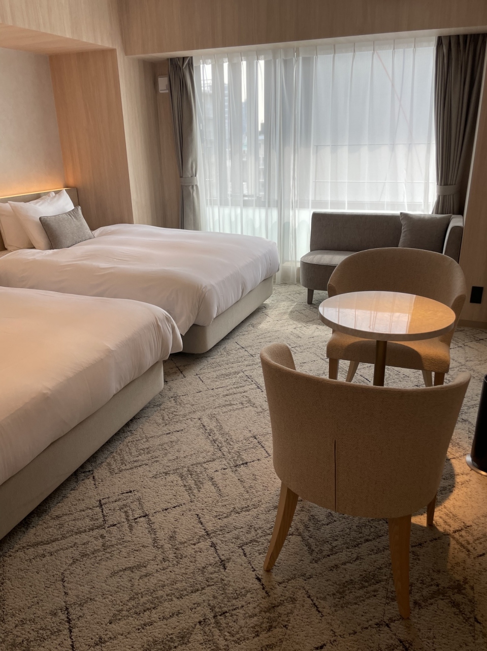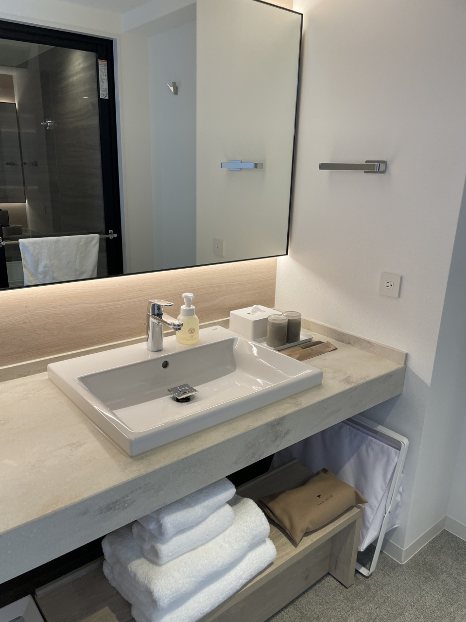 スタンダードツインに宿泊しました。2022年3月オープン、30平方メートルの広いお部屋は使いやすく快適でした。特徴的なのは、入口で靴を脱ぐスタイルで、ホッとするからでしょうか、心地よさを感じました。ベッドはシングルよりも大きめです。アメニティは、歯ブラシ、シャンプーを兼ねたボディソープ以外は、1階エレベーター前のアメニティステーションで必要分をもらいます。1階ロビーには素敵なドリンクコーナーがあり、朝6時からオープンしています。共用スペースには洗濯機、電子レンジ、自動販売機と設備も充実しているので、長期滞在にも向いていると思います。