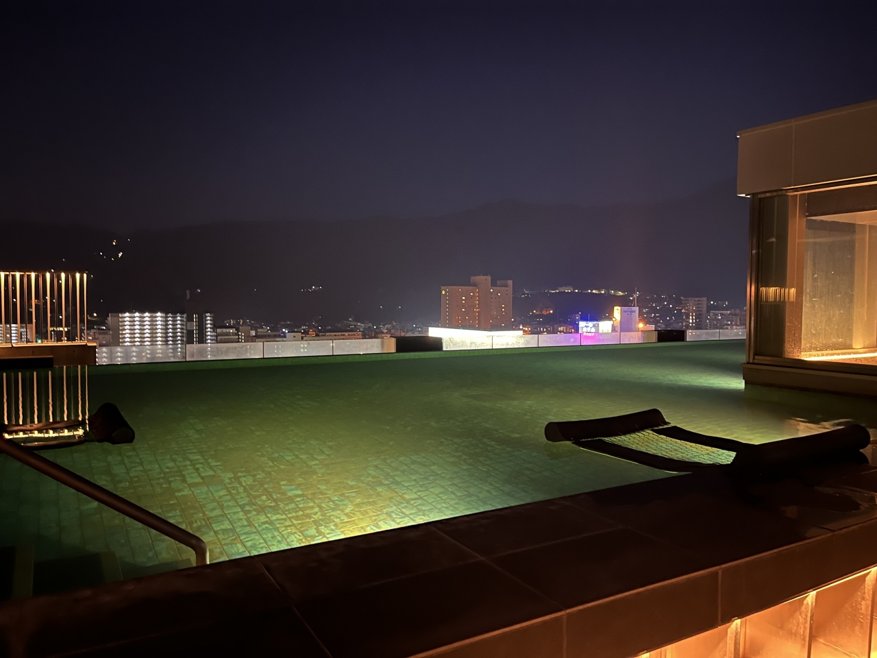また大浴場は外と内にインフィニティ風呂があり、柱を挟んで山、海が楽しめる景色!