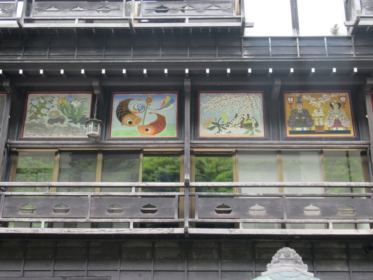 銀山川に架かる白銀橋の近くにある華やかな鏝絵の旅館です。蕎麦屋との間に架かる橋のそばに古山閣の鏝絵の説明板があります。説明板を読みながら川に面した正面の鏝絵を一つずつ見ました。柔らかな線、ユーモラスな表情やデザインなどみごとな鏝絵でした。銀山温泉の顔の一つの旅館です。他の旅館に泊まったので、後で調べるとノスタルジックな大正ロマンを感じられる老舗旅館です。鏝絵を楽しみたい方におすすめの外観です。