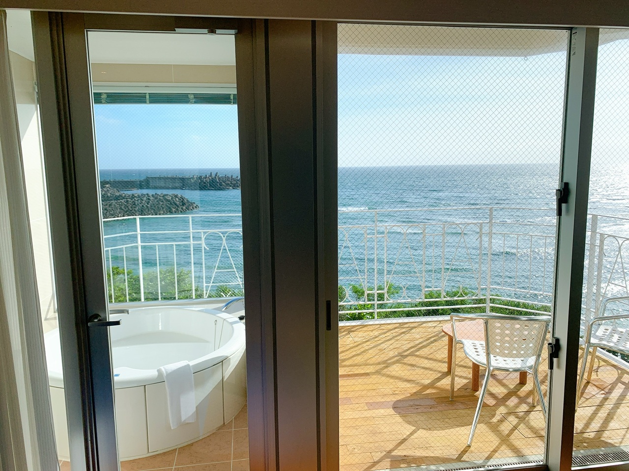 バルコニーにはテーブルと椅子があるので、のんびりと海を眺めることができました。バルコニーの横には大きめのジャグジーがあり、晴れていればサンセットを楽しみながら入浴できます。ジャグジー以外に室内にシャワースペースもあります。