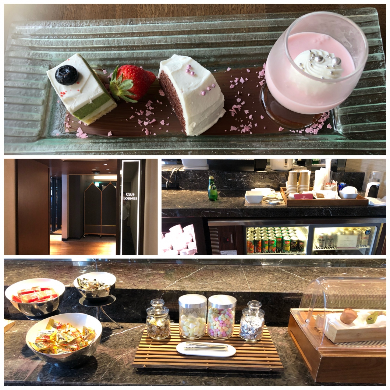 クラブラウンジでアフタヌーンティーは、スイーツのプレート(上)が提供され、フリードリンク(コーヒー・紅茶・ジュース)と焼き菓子などはビュッフェスタイルです。