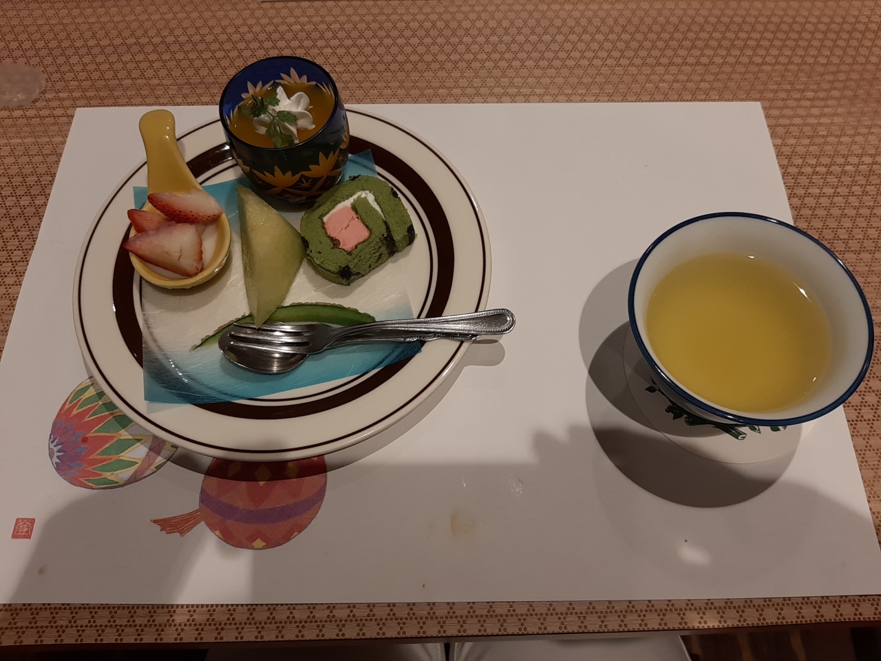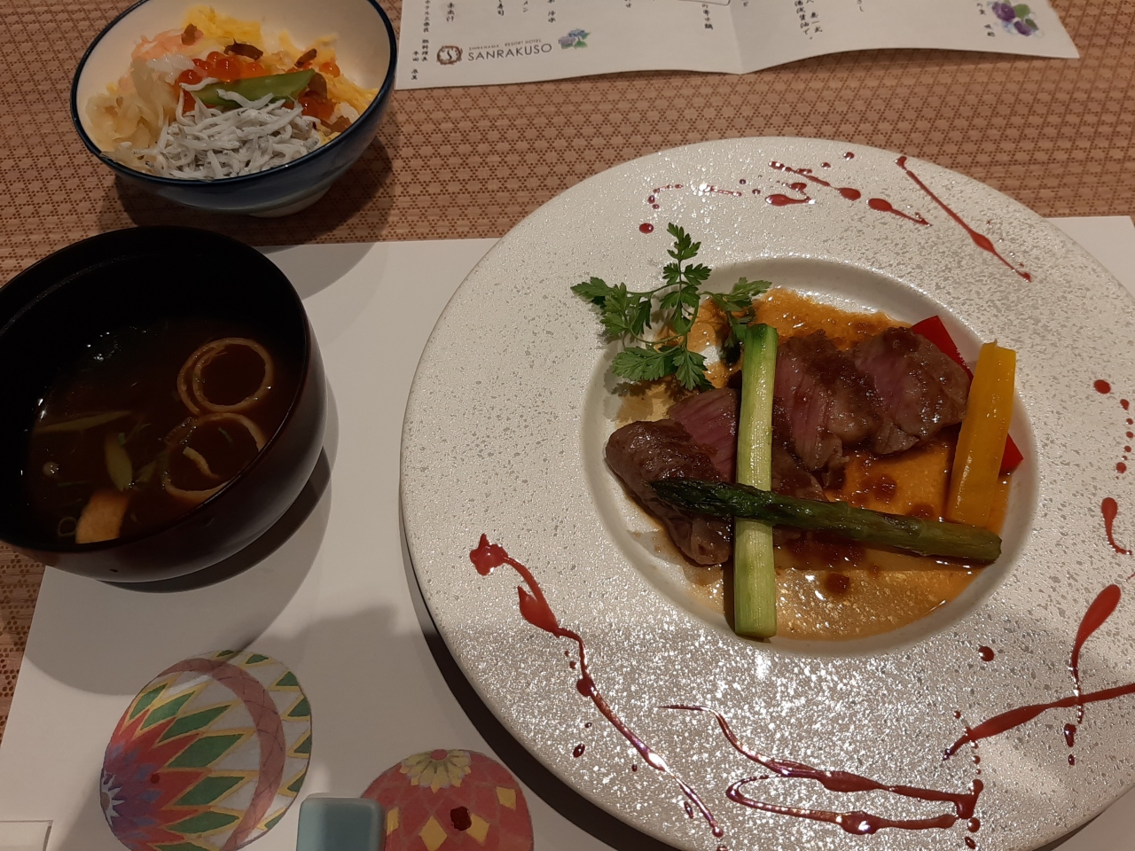 夕食の食器も綺麗で何を食べても美味しかったです。ハーフバイキングでちらし寿司と赤だし、カボチャのサラダにアボカドをのせて食べました